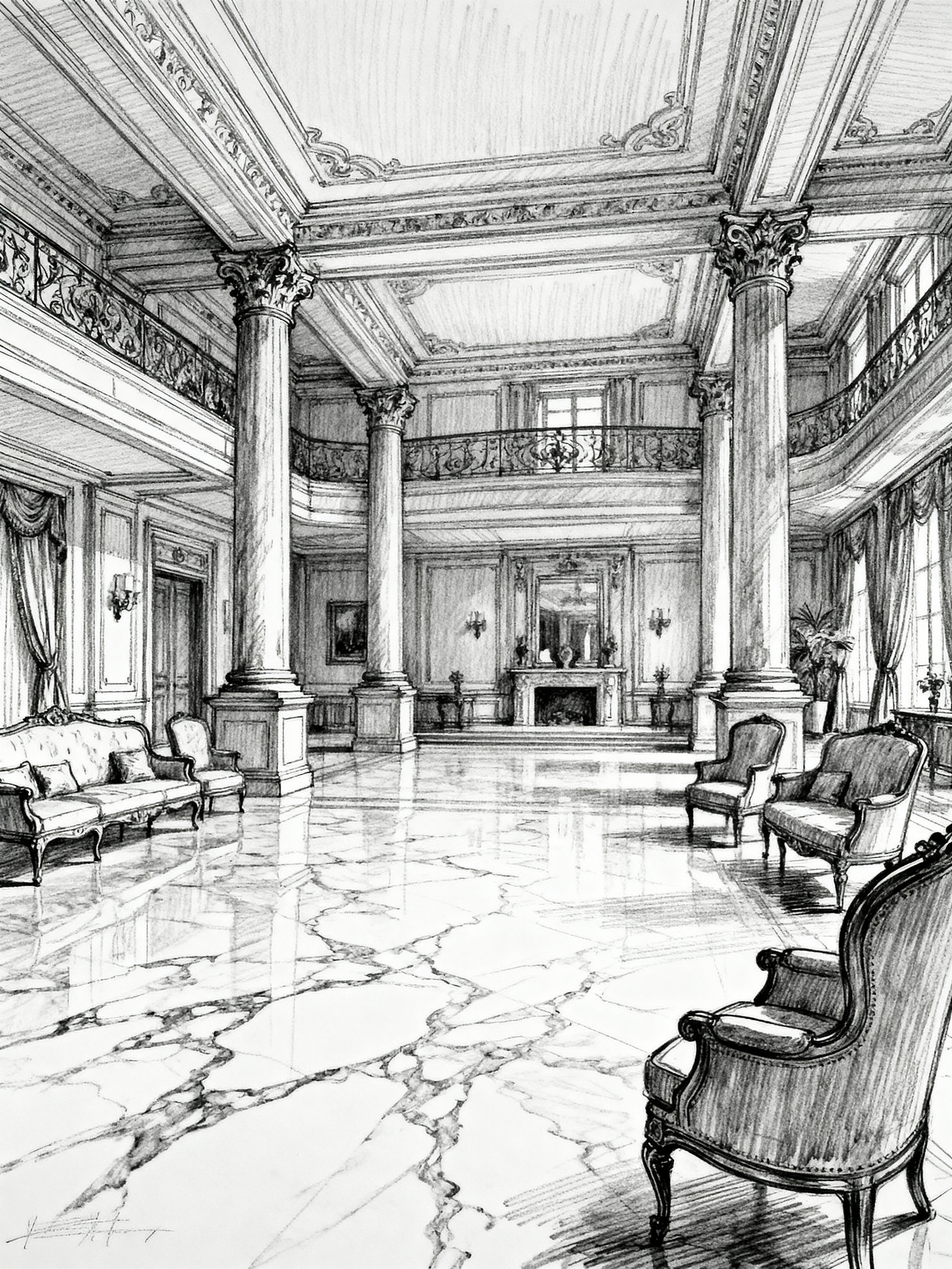 (hand-drawn monochrome black and white sketch line drawing)++ of sketch-style interior designed (ballroom) apartment interior. a sketch of interior. with . . a sketch of interior. with ornate columns and marble floors and elegant seating. trending on artstation. black and white line drawing sketch without colors.