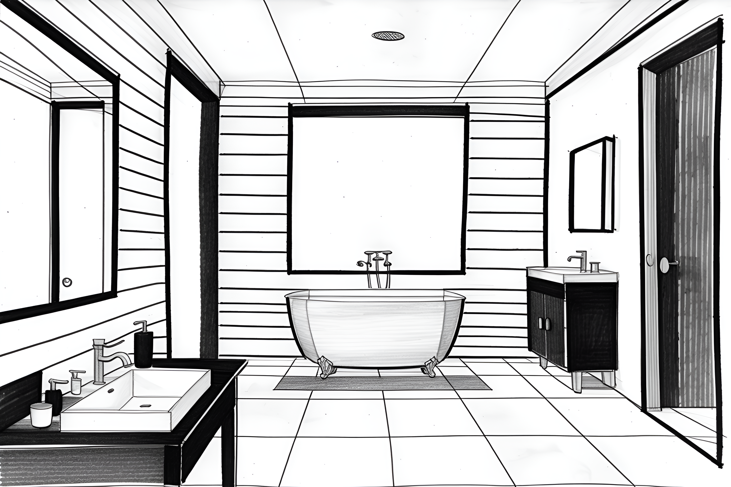 (Hand-drawn monochrome black and white sketch line drawing)++ of Sketch-style interior designed (bath room) apartment interior. A sketch of interior. With . A sketch of interior. With mirror and bathroom sink with faucet and bathtub. Trending on Artstation. Black and white line drawing sketch without colors.