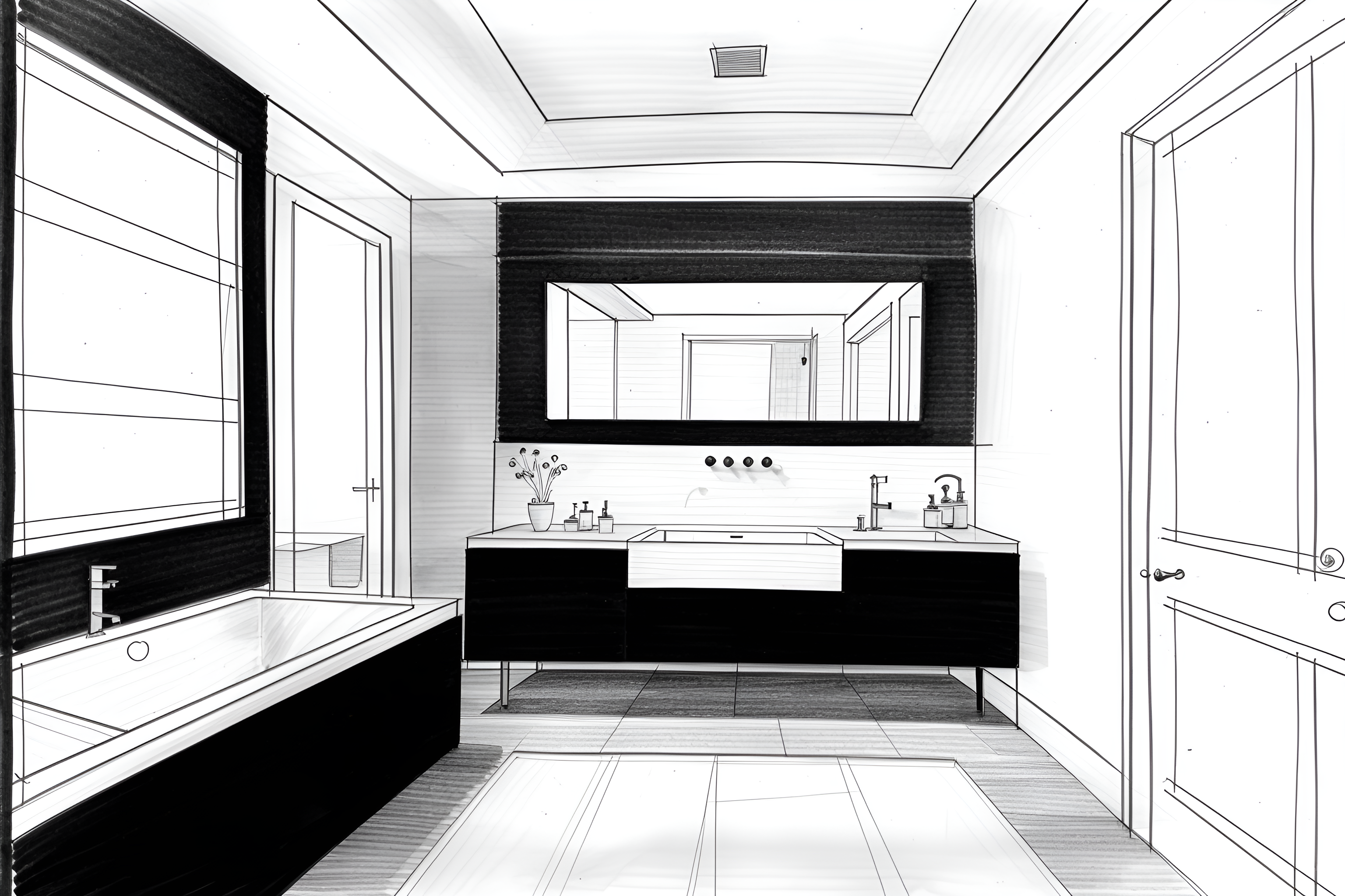 (Hand-drawn monochrome black and white sketch line drawing)++ of Sketch-style interior designed (bath room) apartment interior. A sketch of interior. With . A sketch of interior. With mirror and bathroom sink with faucet and bathtub. Trending on Artstation. Black and white line drawing sketch without colors.