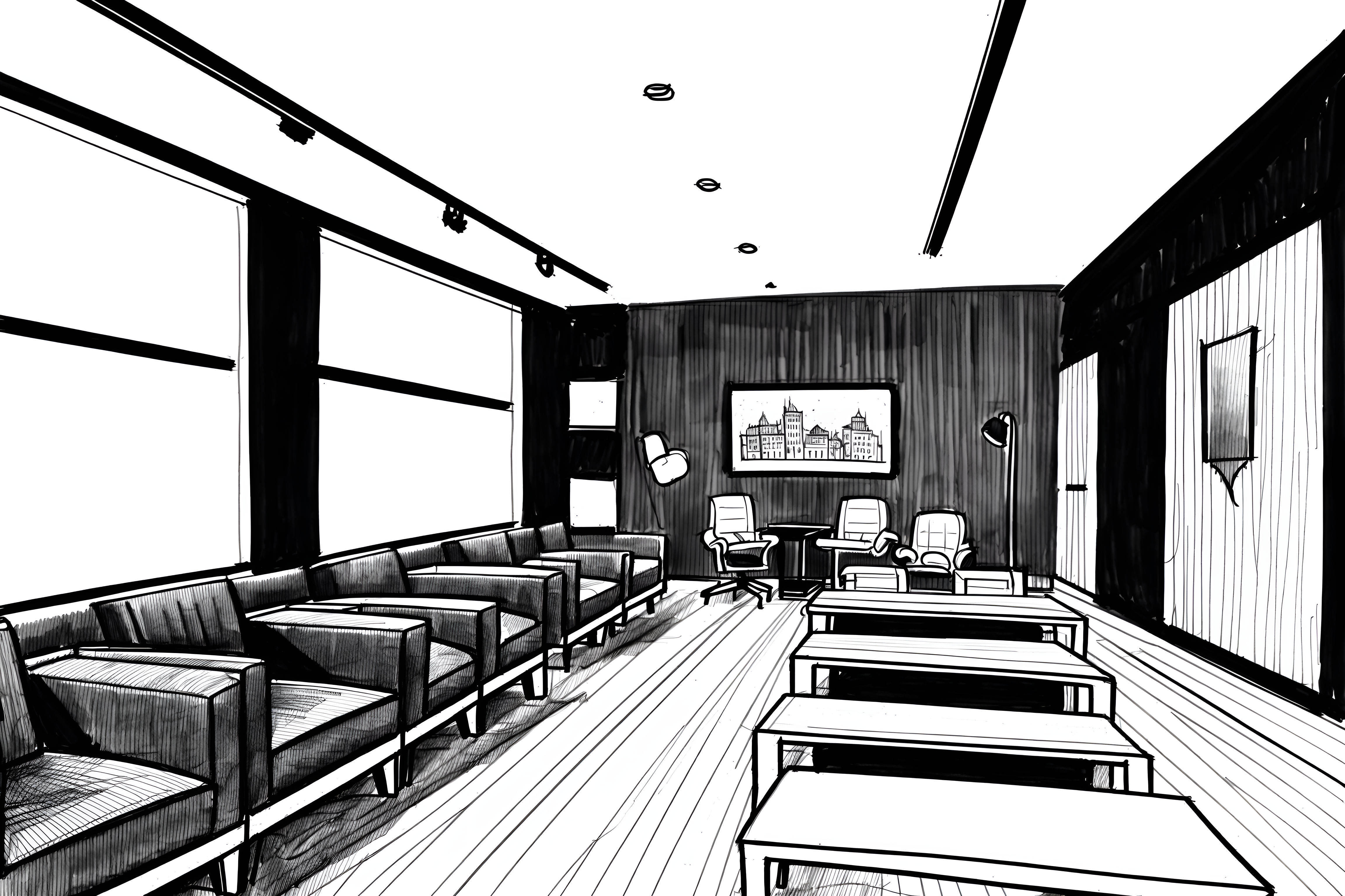 (hand-drawn monochrome black and white sketch line drawing)++ of sketch-style interior designed (coworking space) apartment interior. a sketch of interior. with . . a sketch of interior. with office desks and office chairs and seating area with sofa. trending on artstation. black and white line drawing sketch without colors. masterpiece, cinematic light, ultrarealistic+, photorealistic+, 8k, raw photo, realistic, sharp focus on eyes, (symmetrical eyes), (intact eyes), hyperrealistic, highest quality, best quality, , highly detailed, masterpiece, best quality, extremely detailed 8k wallpaper, masterpiece, best quality, ultra-detailed, best shadow, detailed background, detailed face, detailed eyes, high contrast, best illumination, detailed face, dulux, caustic, dynamic angle, detailed glow. dramatic lighting. highly detailed, insanely detailed hair, symmetrical, intricate details, professionally retouched, 8k high definition. strong bokeh. award winning photo.