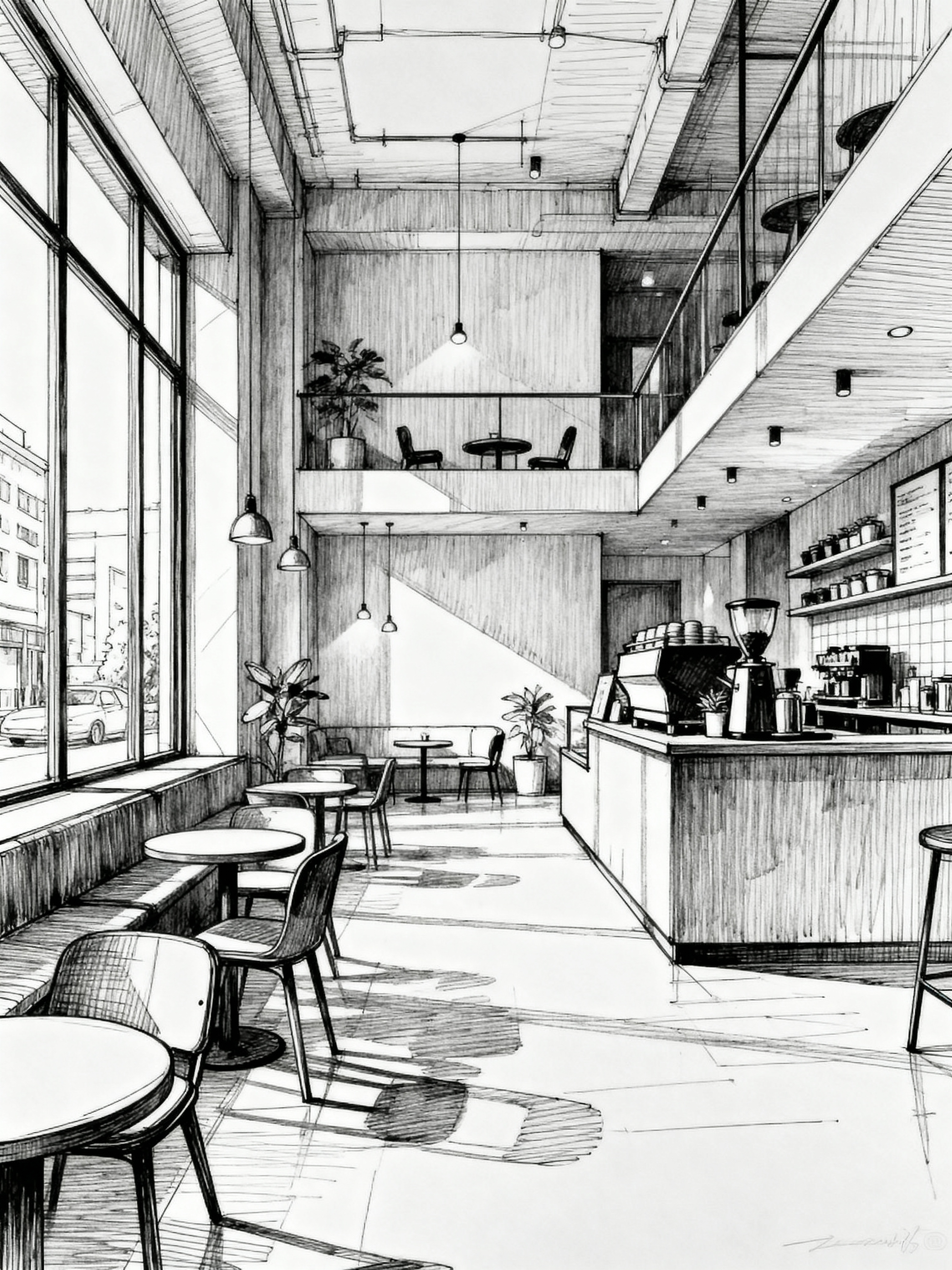 (hand-drawn monochrome black and white sketch line drawing)++ of sketch-style interior designed (coffee shop) apartment interior. a sketch of interior. with . . a sketch of interior. trending on artstation. black and white line drawing sketch without colors.