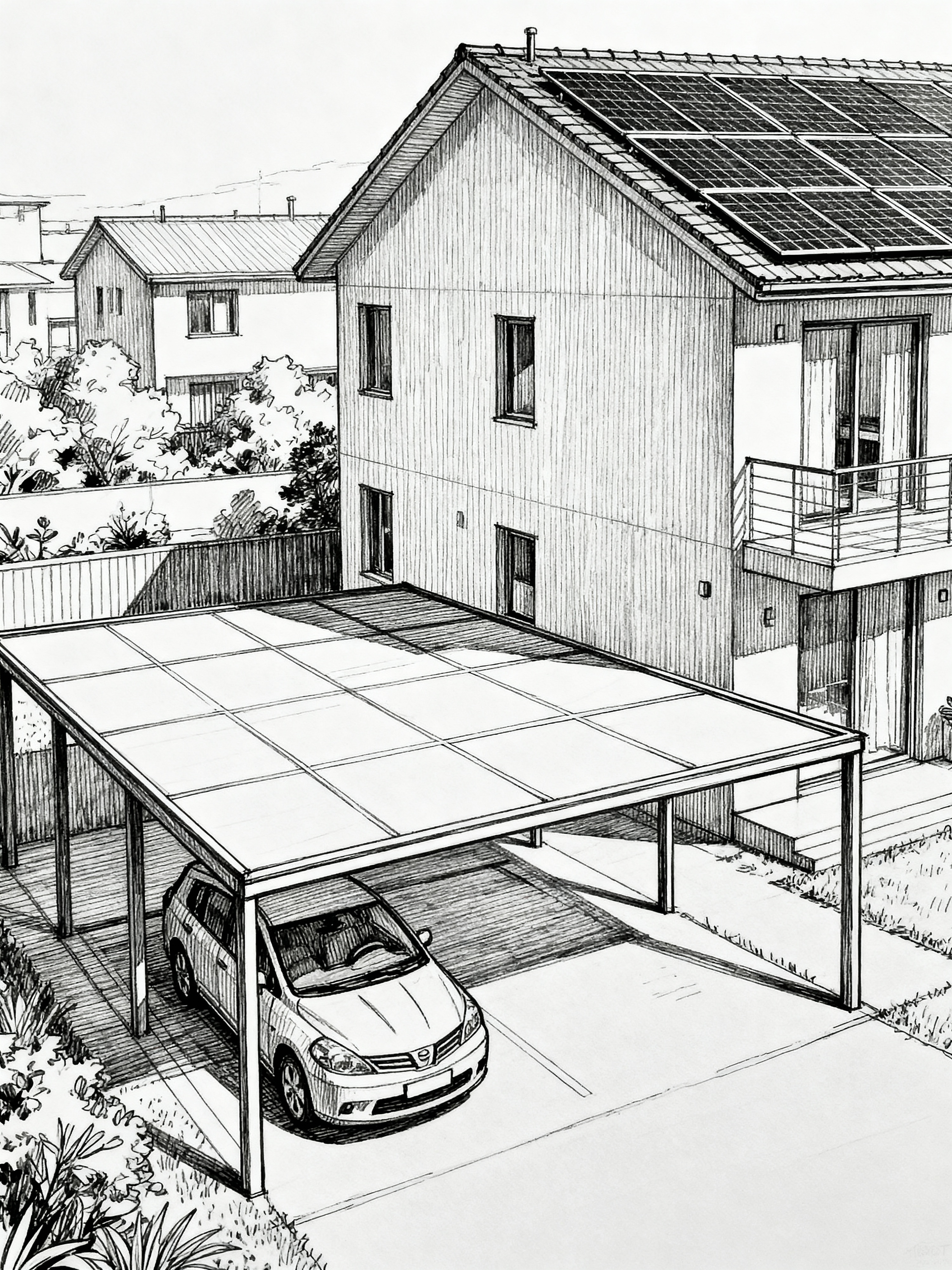 (hand-drawn monochrome black and white sketch line drawing)++ of sketch-style interior designed (carport) apartment interior. a sketch of interior. with . . a sketch of interior. with carport and canopy and roof solar panels. trending on artstation. black and white line drawing sketch without colors.