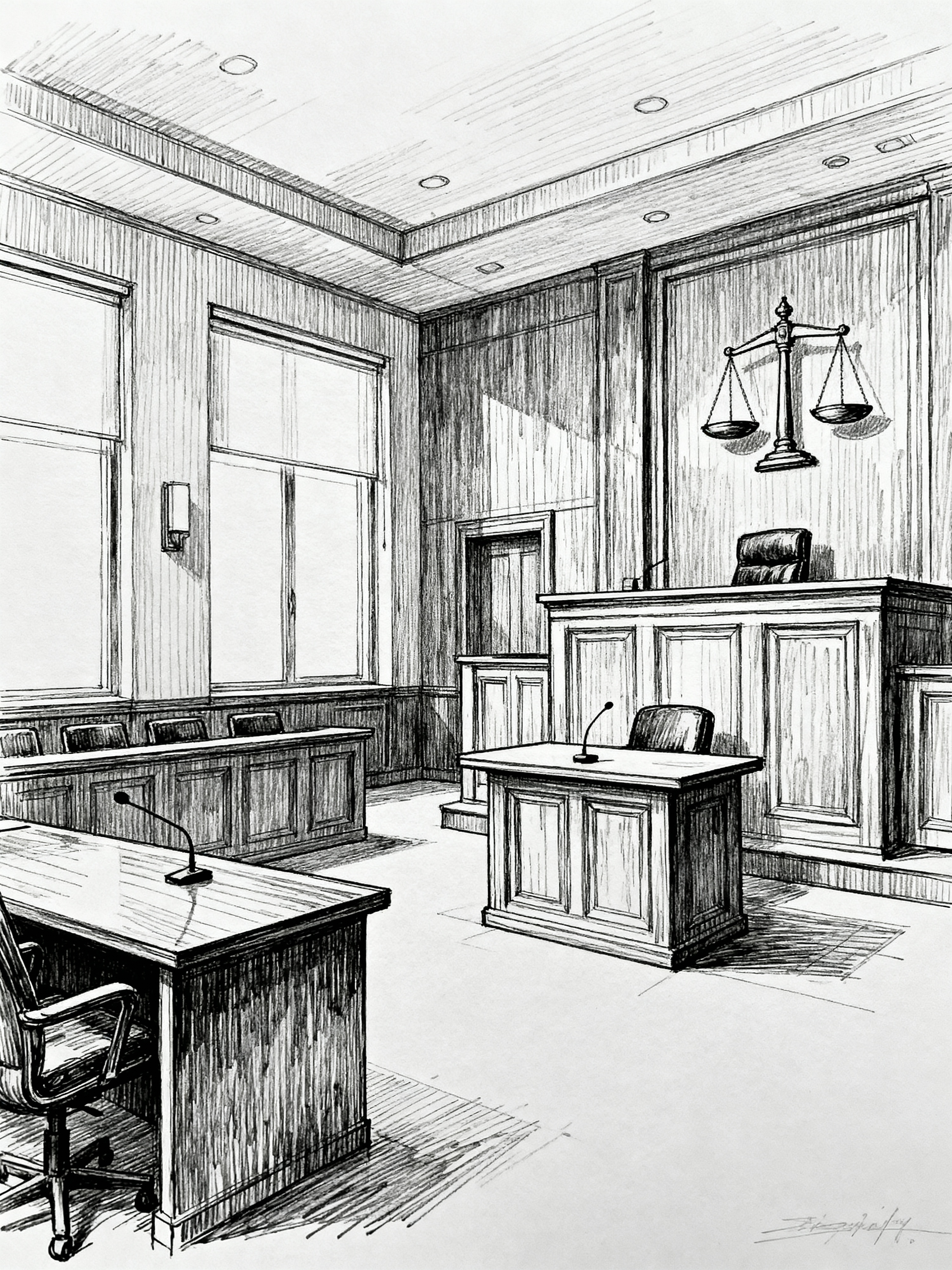 (hand-drawn monochrome black and white sketch line drawing)++ of sketch-style interior designed (courtroom) apartment interior. a sketch of interior. with . . a sketch of interior. with scales of justice and attorney tables and witness stand. trending on artstation. black and white line drawing sketch without colors.