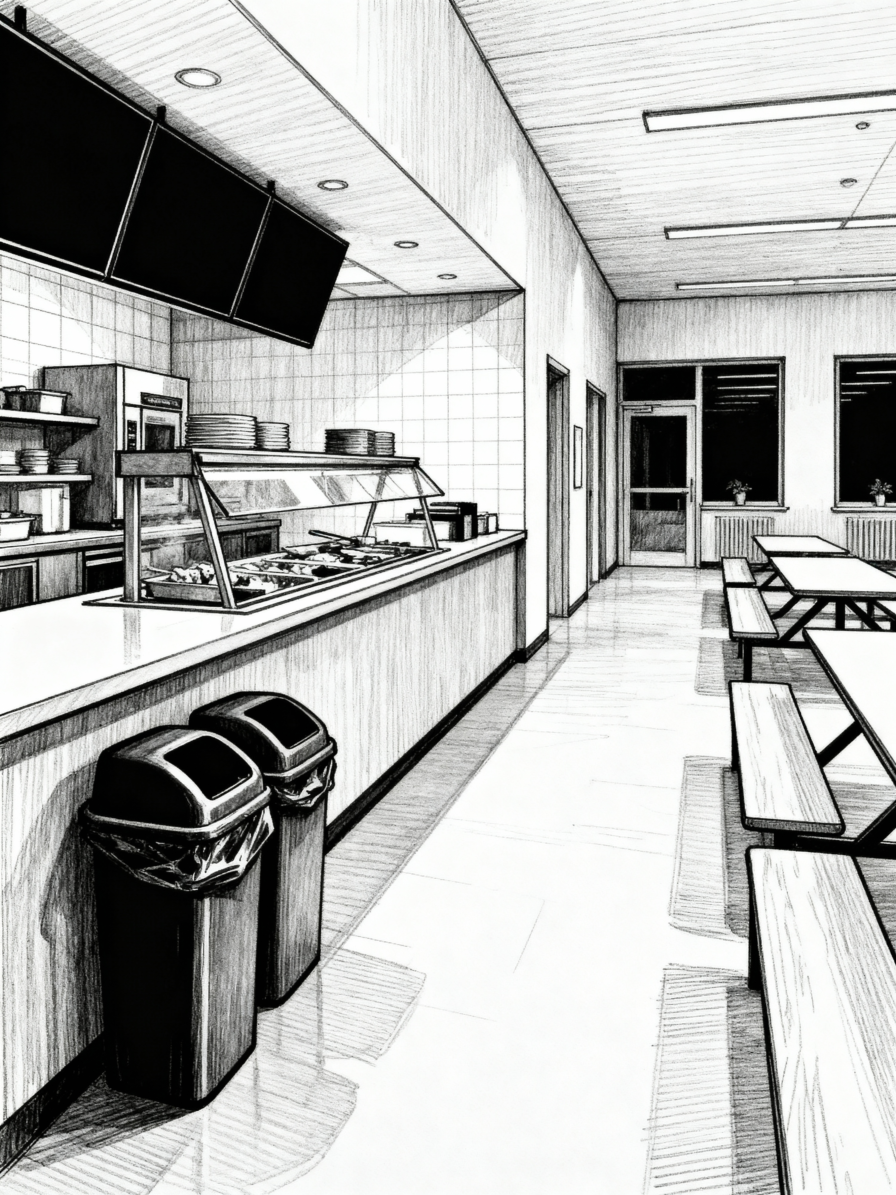 (hand-drawn monochrome black and white sketch line drawing)++ of sketch-style interior designed (cafeteria) apartment interior. a sketch of interior. with . . a sketch of interior. with food service counter and trash bins and benches. trending on artstation. black and white line drawing sketch without colors.
