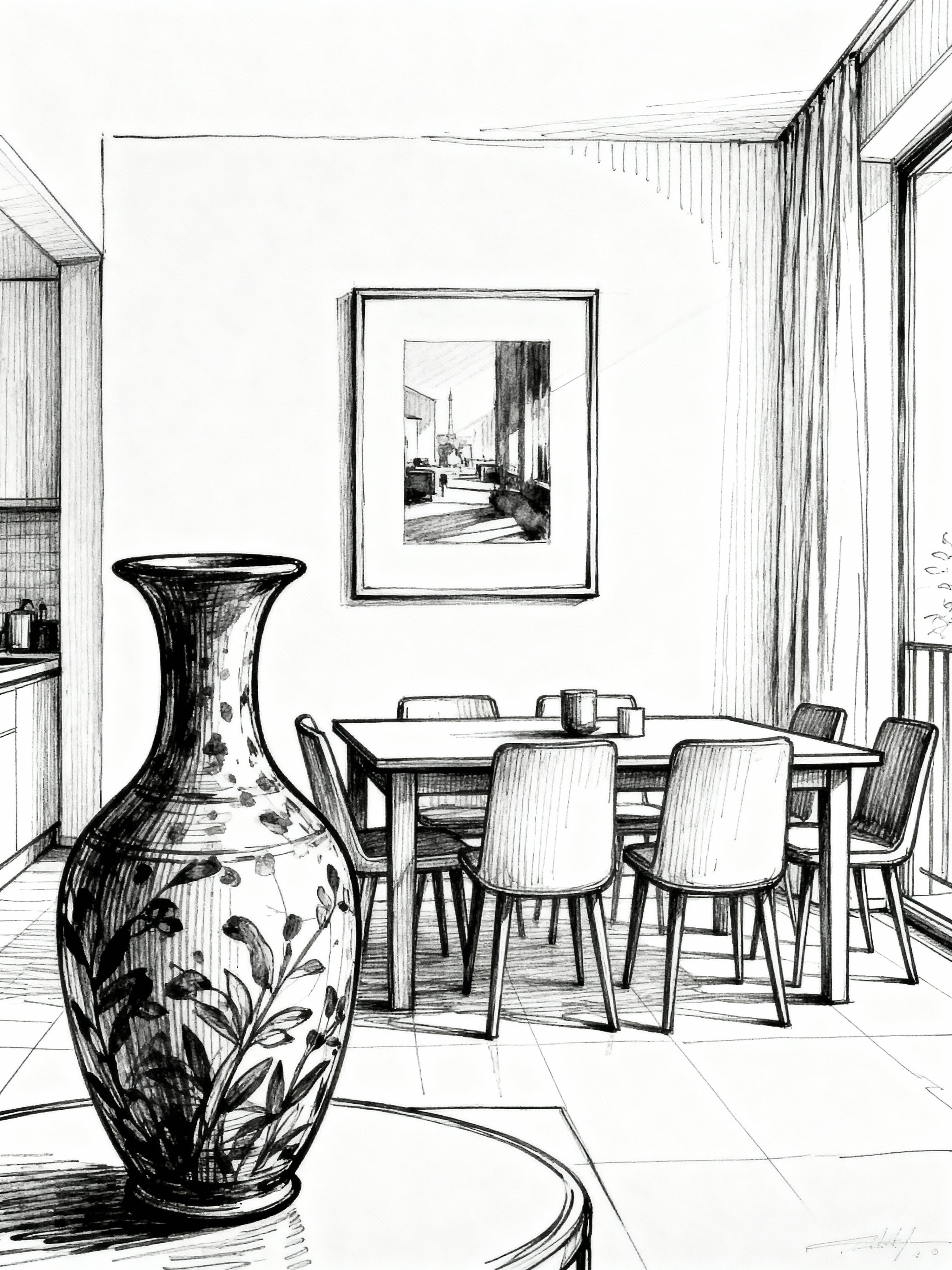 (hand-drawn monochrome black and white sketch line drawing)++ of sketch-style interior designed (dining room) apartment interior. a sketch of interior. with . . a sketch of interior. with vase and dining table and painting or photo on wall. trending on artstation. black and white line drawing sketch without colors.