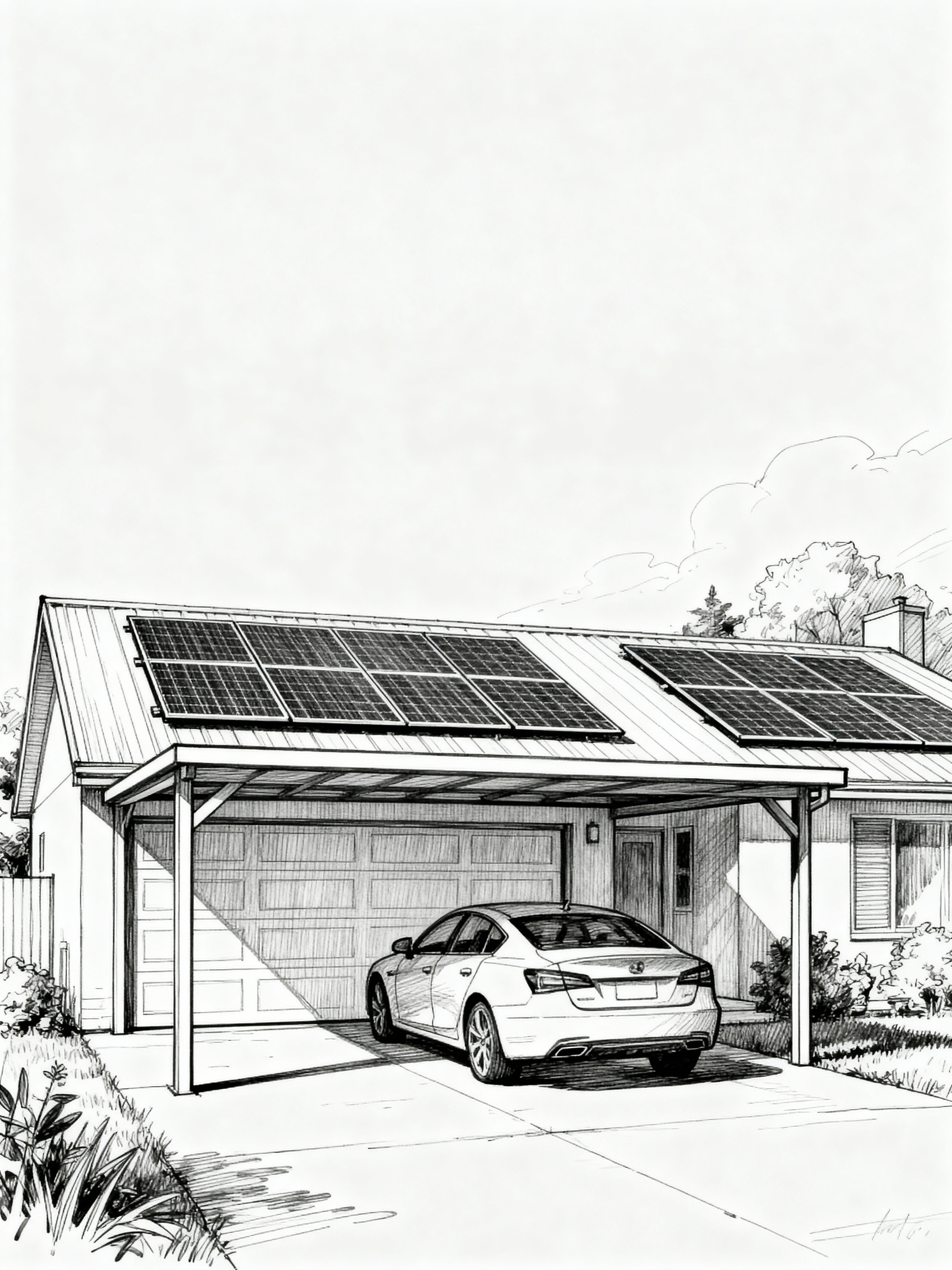 (hand-drawn monochrome black and white sketch line drawing)++ of sketch-style designed (outdoor garage) . a sketch of . with . . a sketch of . with canopy and roof solar panels and carport. trending on artstation. black and white line drawing sketch without colors.