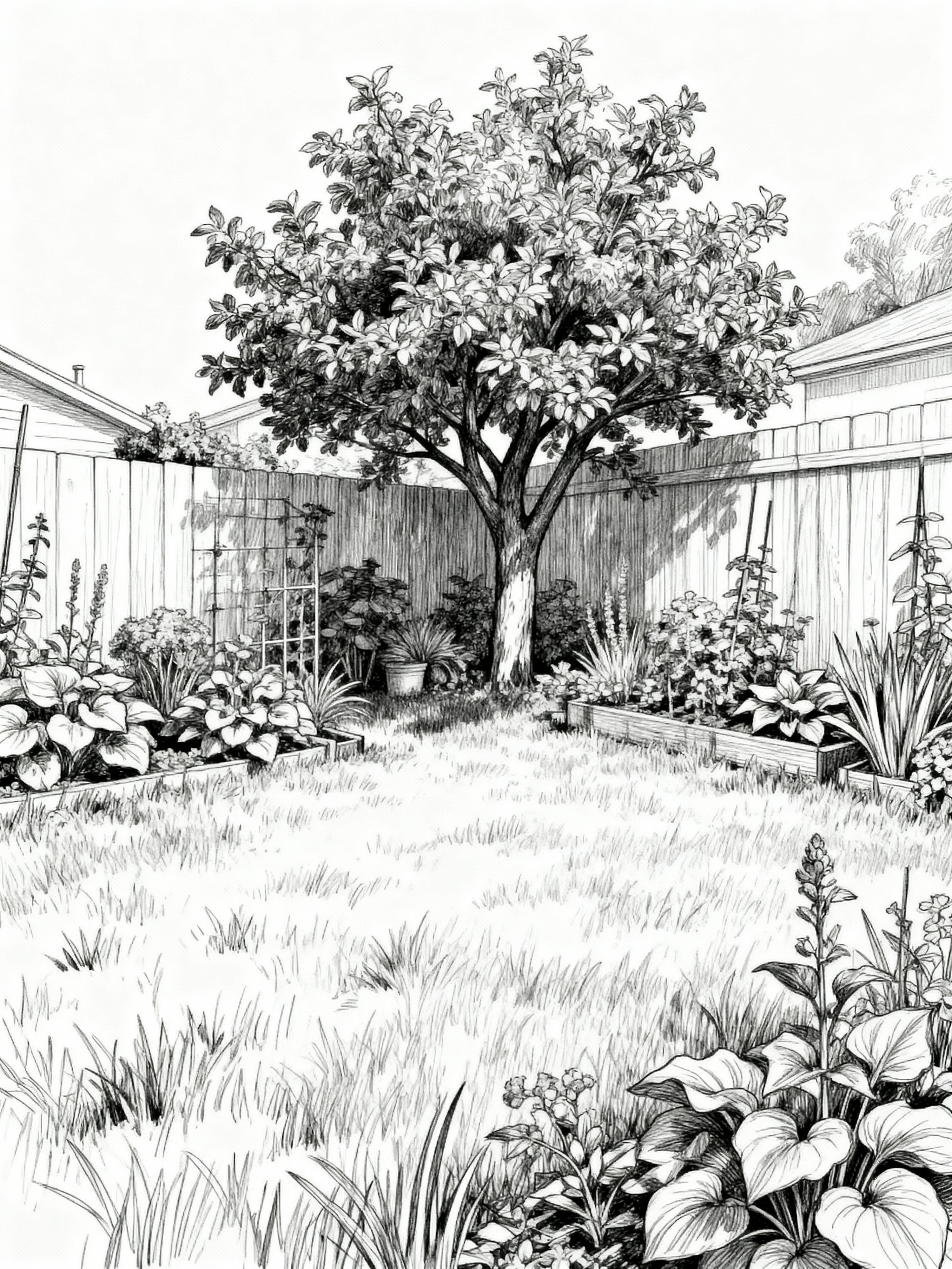 (hand-drawn monochrome black and white sketch line drawing)++ of sketch-style designed (outdoor garden) . a sketch of . with . . a sketch of . with grass and garden plants and garden tree. trending on artstation. black and white line drawing sketch without colors.