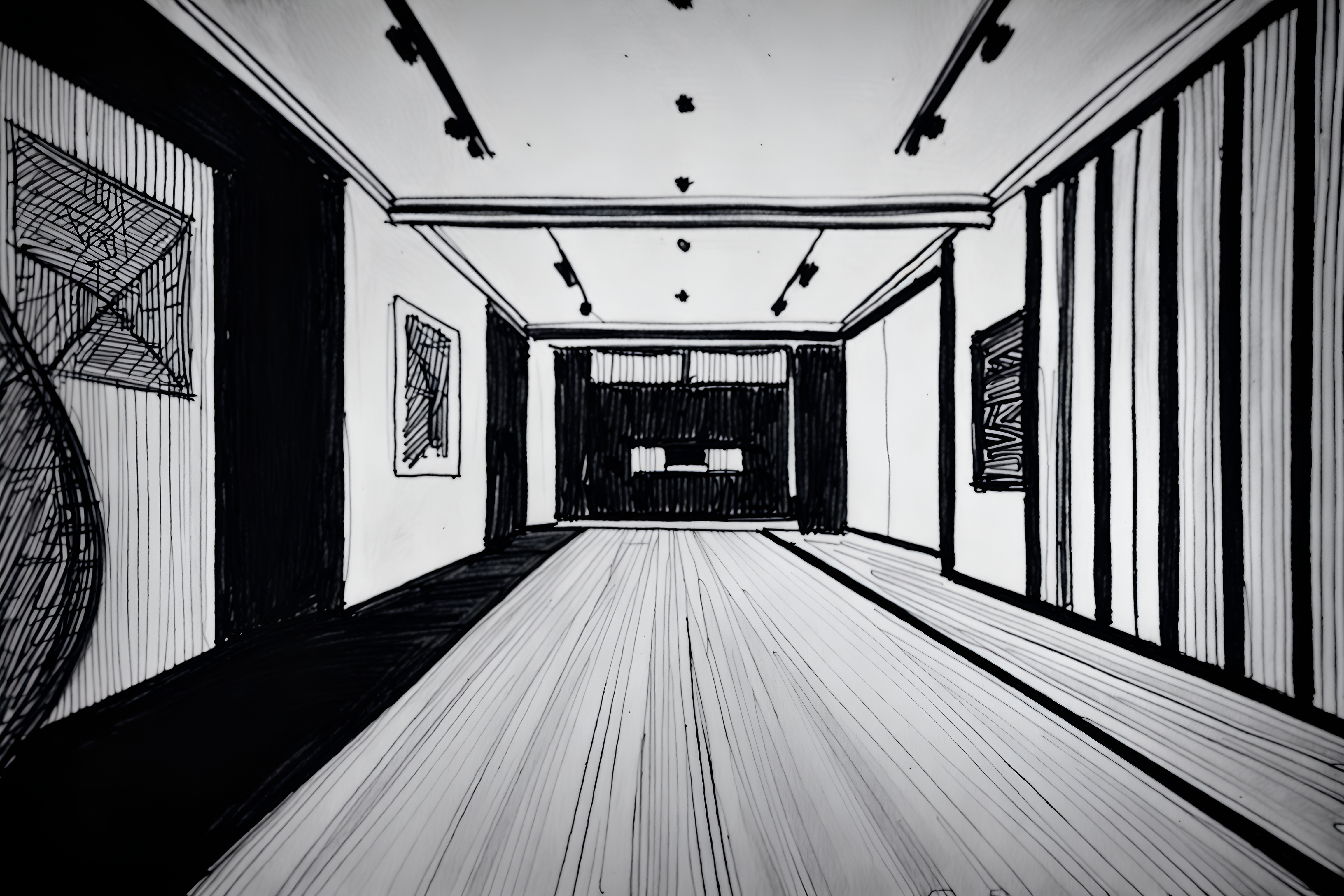sketch exhibition spaces(hand-drawn monochrome black and white sketch line drawing)++ of sketch-style interior designed (exhibition space) apartment interior. a sketch of interior. with . . a sketch of interior. with pedestals and barriers and display cases. trending on artstation. black and white line drawing sketch without colors.