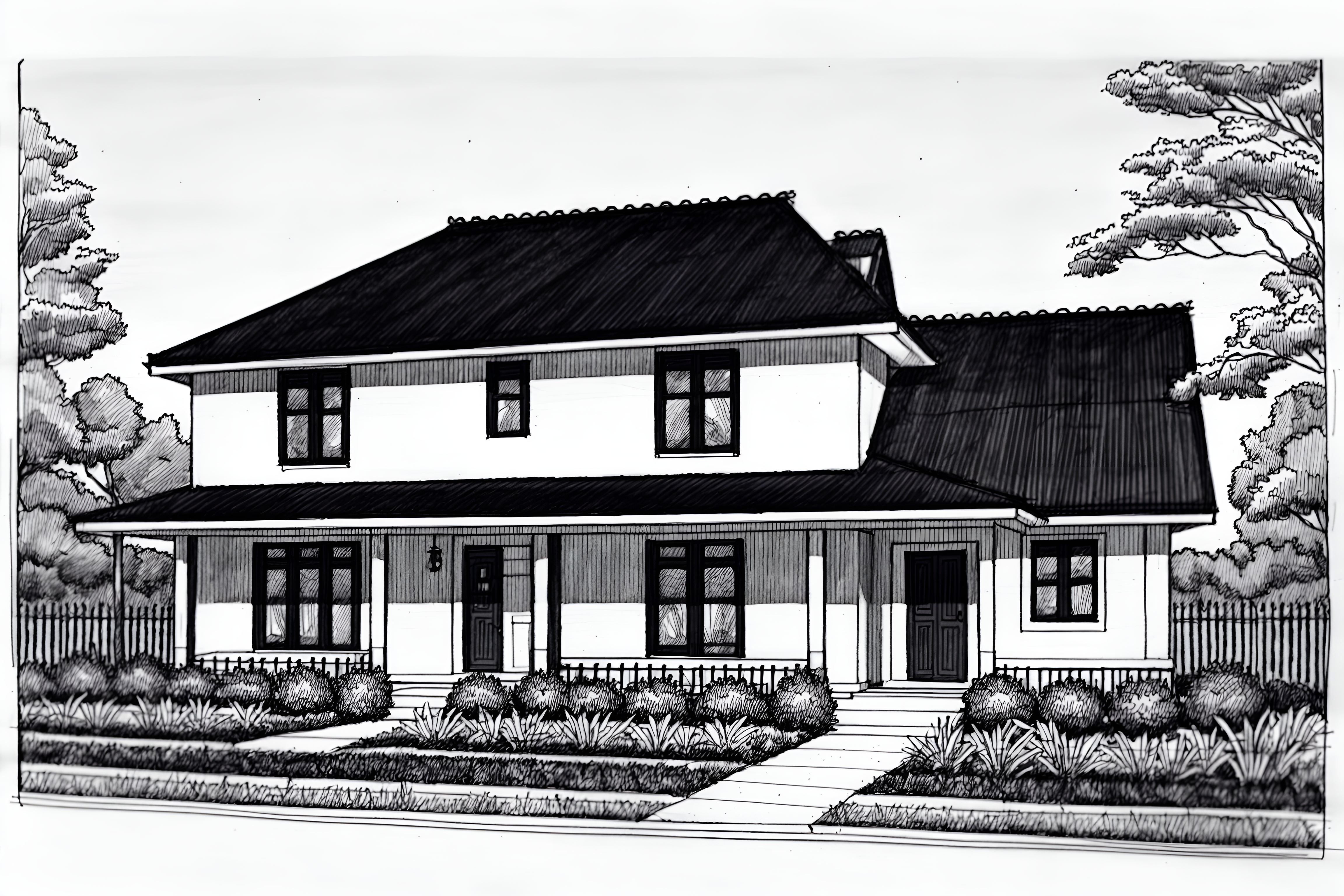 (hand-drawn monochrome black and white sketch line drawing)++ of sketch-style exterior designed (house exterior) architecture house exterior. a sketch of exterior. with . . a sketch of exterior. trending on artstation. black and white line drawing sketch without colors. masterpiece, cinematic light, ultrarealistic+, photorealistic+, 8k, raw photo, realistic, sharp focus on eyes, (symmetrical eyes), (intact eyes), hyperrealistic, highest quality, best quality, , highly detailed, masterpiece, best quality, extremely detailed 8k wallpaper, masterpiece, best quality, ultra-detailed, best shadow, detailed background, detailed face, detailed eyes, high contrast, best illumination, detailed face, dulux, caustic, dynamic angle, detailed glow. dramatic lighting. highly detailed, insanely detailed hair, symmetrical, intricate details, professionally retouched, 8k high definition. strong bokeh. award winning photo.