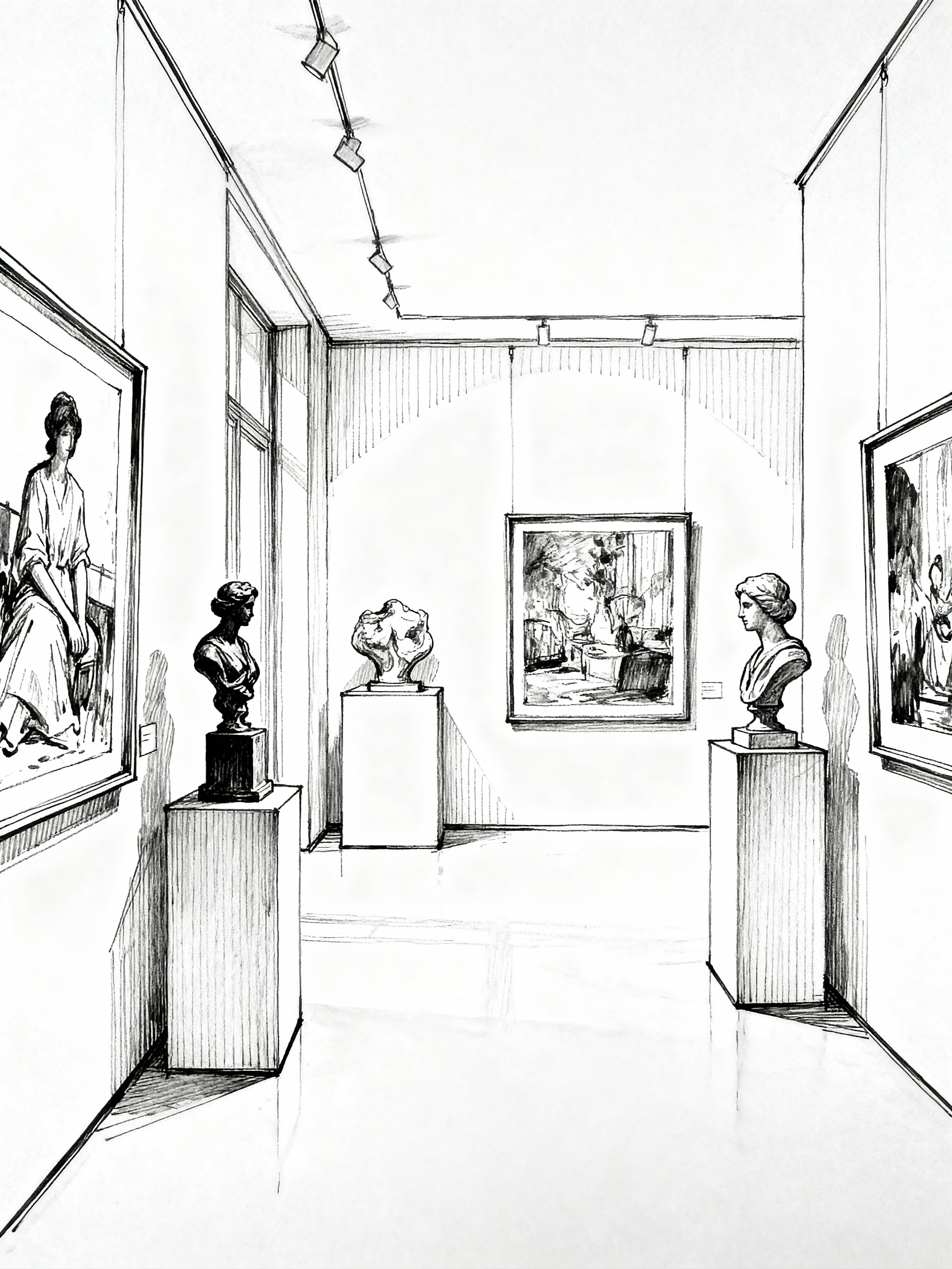 (hand-drawn monochrome black and white sketch line drawing)++ of sketch-style interior designed (gallery) apartment interior. a sketch of interior. with . . a sketch of interior. with artwork and paintings and pedestals. trending on artstation. black and white line drawing sketch without colors.
