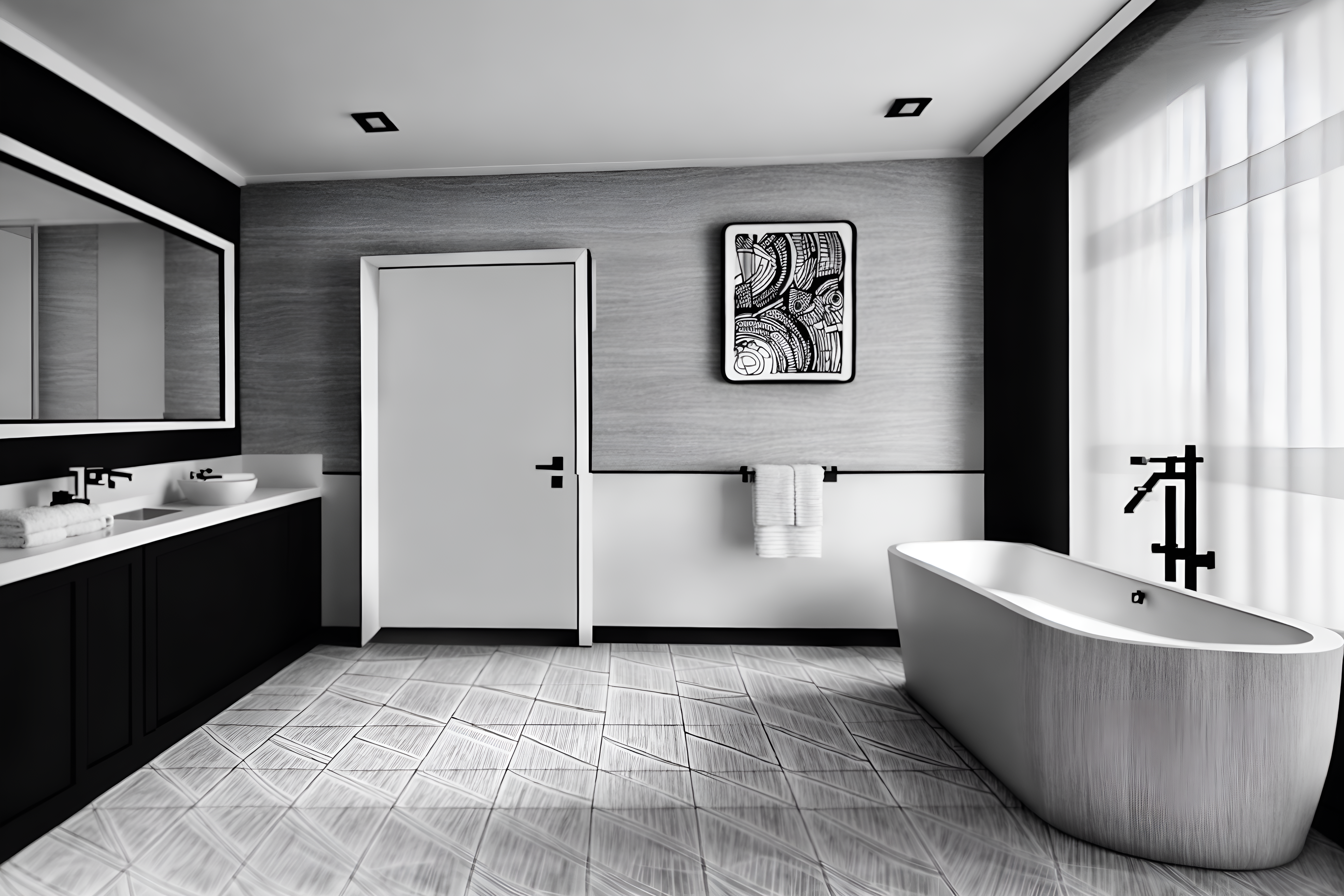 (hand-drawn monochrome black and white sketch line drawing)++ of sketch-style interior designed (hotel bathroom) apartment interior. a sketch of interior. with . . a sketch of interior. with bath towel and shower and mirror. trending on artstation. black and white line drawing sketch without colors. masterpiece, cinematic light, ultrarealistic+, photorealistic+, 8k, raw photo, realistic, sharp focus on eyes, (symmetrical eyes), (intact eyes), hyperrealistic, highest quality, best quality, , highly detailed, masterpiece, best quality, extremely detailed 8k wallpaper, masterpiece, best quality, ultra-detailed, best shadow, detailed background, detailed face, detailed eyes, high contrast, best illumination, detailed face, dulux, caustic, dynamic angle, detailed glow. dramatic lighting. highly detailed, insanely detailed hair, symmetrical, intricate details, professionally retouched, 8k high definition. strong bokeh. award winning photo.