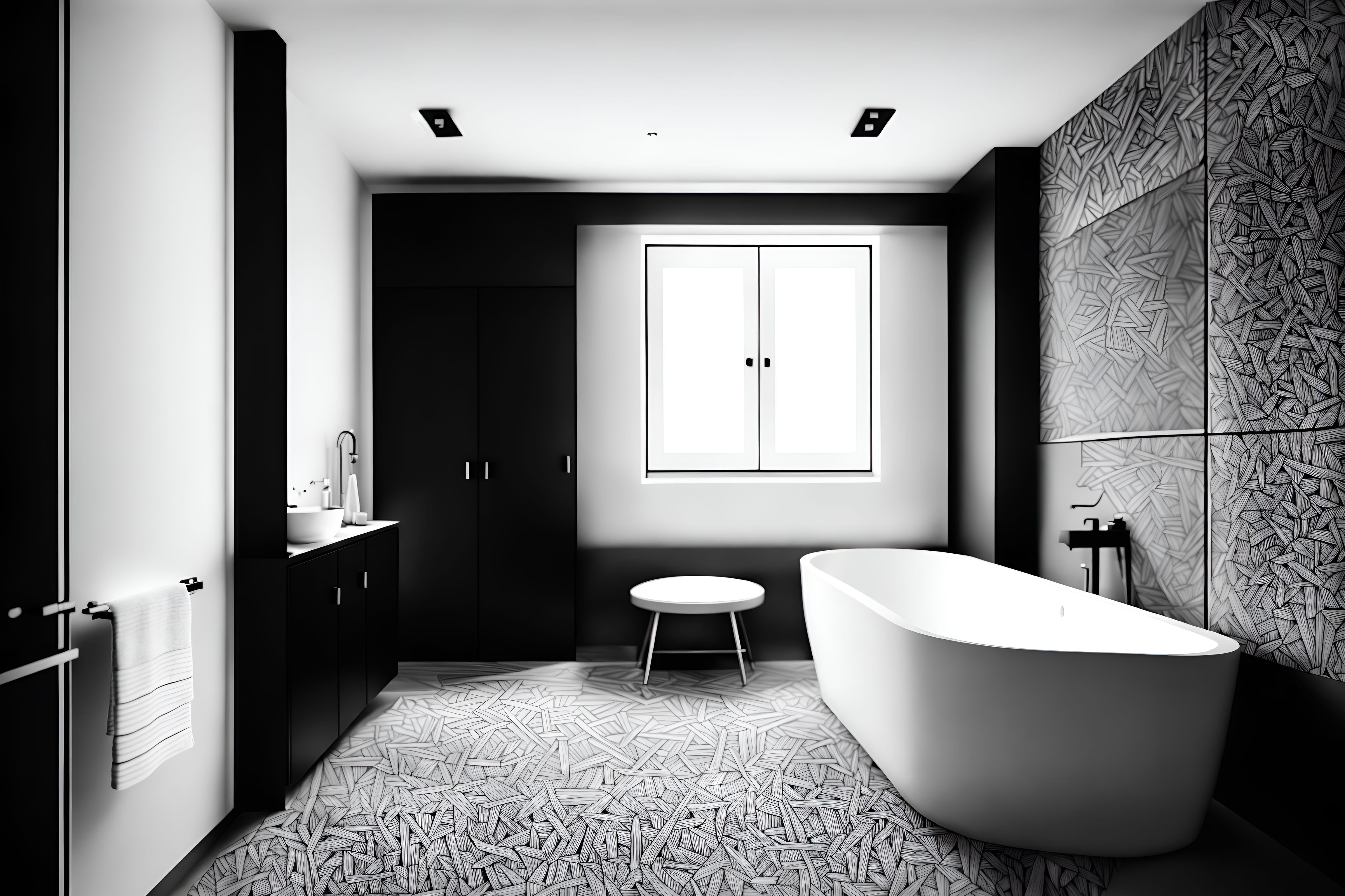 sketch hotel bathrooms(hand-drawn monochrome black and white sketch line drawing)++ of sketch-style interior designed (hotel bathroom) apartment interior. a sketch of interior. with . . a sketch of interior. with bath towel and plant and bath rail. trending on artstation. black and white line drawing sketch without colors.