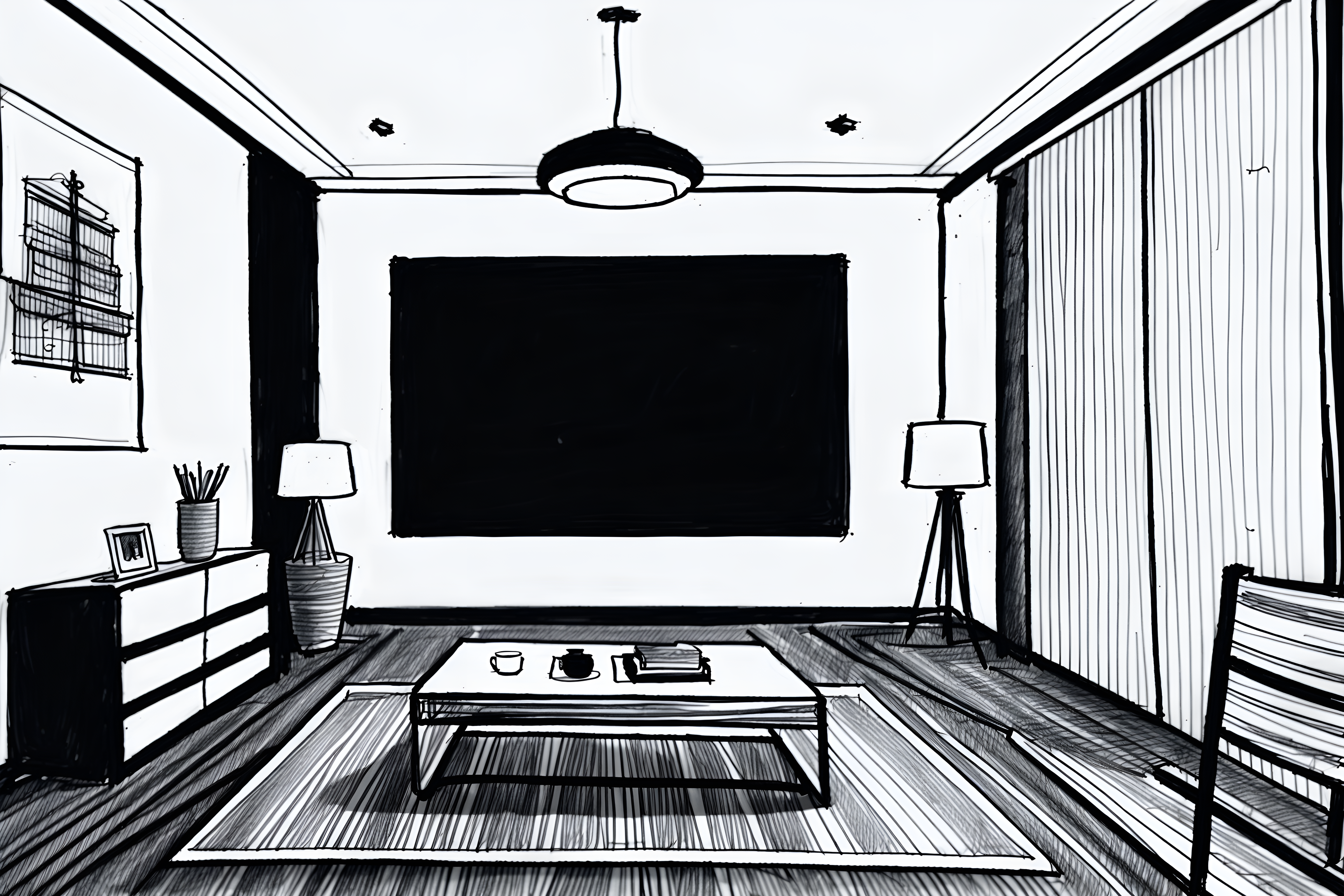 (hand-drawn monochrome black and white sketch line drawing)++ of sketch-style interior designed (home office) apartment interior. a sketch of interior. with . . a sketch of interior. with office chair and cabinets and desk lamp. trending on artstation. black and white line drawing sketch without colors. masterpiece, cinematic light, ultrarealistic+, photorealistic+, 8k, raw photo, realistic, sharp focus on eyes, (symmetrical eyes), (intact eyes), hyperrealistic, highest quality, best quality, , highly detailed, masterpiece, best quality, extremely detailed 8k wallpaper, masterpiece, best quality, ultra-detailed, best shadow, detailed background, detailed face, detailed eyes, high contrast, best illumination, detailed face, dulux, caustic, dynamic angle, detailed glow. dramatic lighting. highly detailed, insanely detailed hair, symmetrical, intricate details, professionally retouched, 8k high definition. strong bokeh. award winning photo.