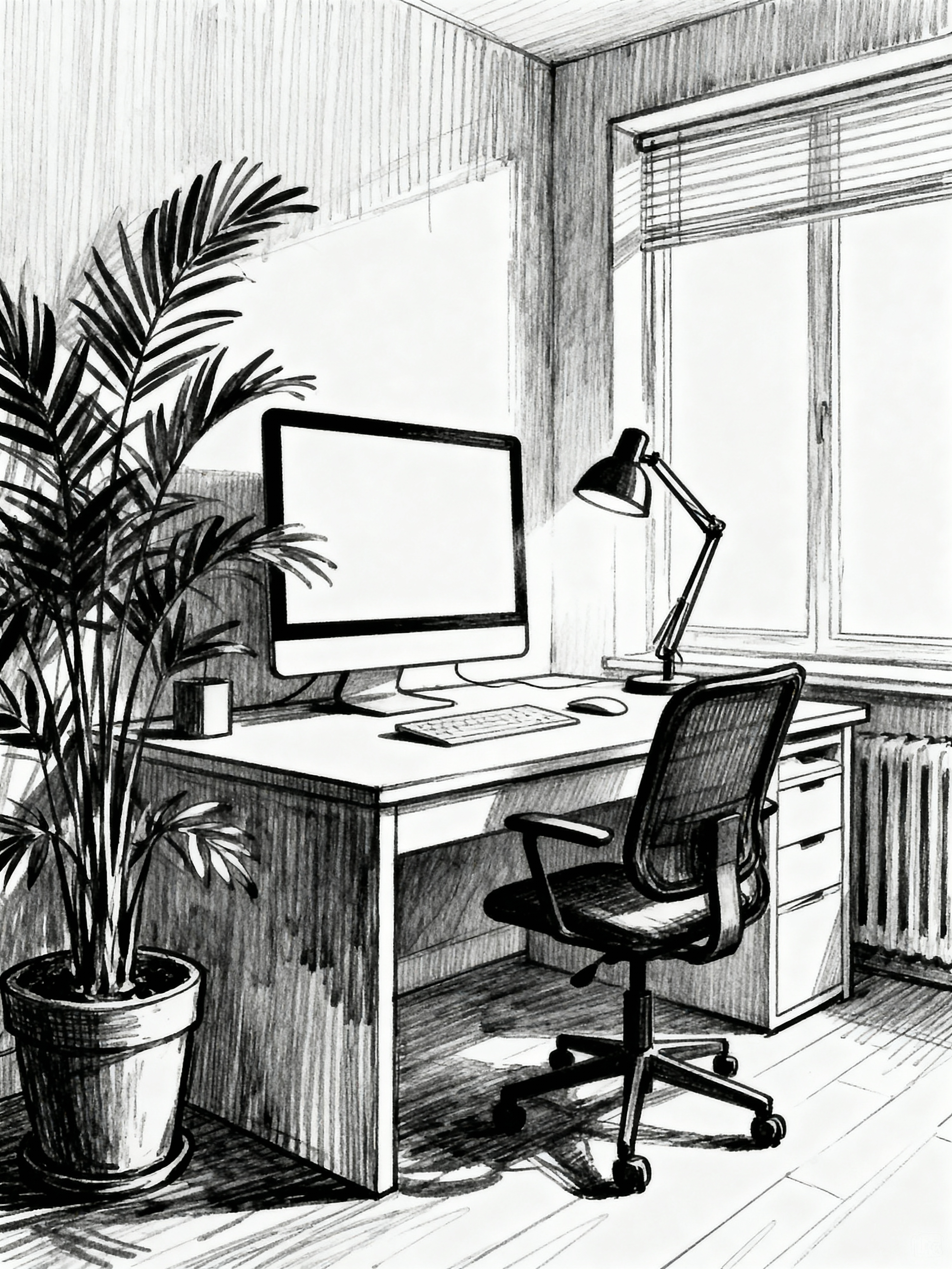 (hand-drawn monochrome black and white sketch line drawing)++ of sketch-style interior designed (home office) apartment interior. a sketch of interior. with . . a sketch of interior. with computer desk and plant and desk lamp. trending on artstation. black and white line drawing sketch without colors.