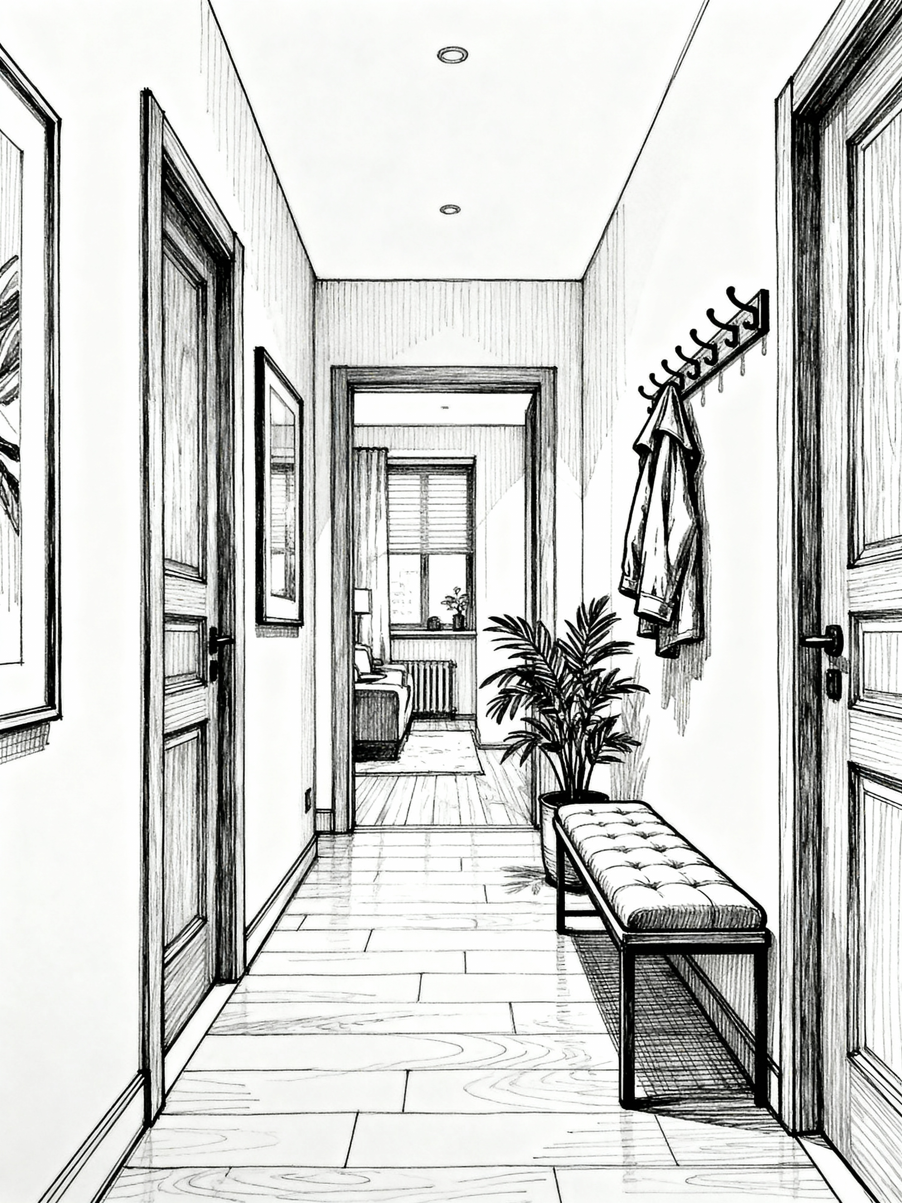(hand-drawn monochrome black and white sketch line drawing)++ of sketch-style interior designed (hallway) apartment interior. a sketch of interior. with . . a sketch of interior. with bench and coat rack and plant. trending on artstation. black and white line drawing sketch without colors.