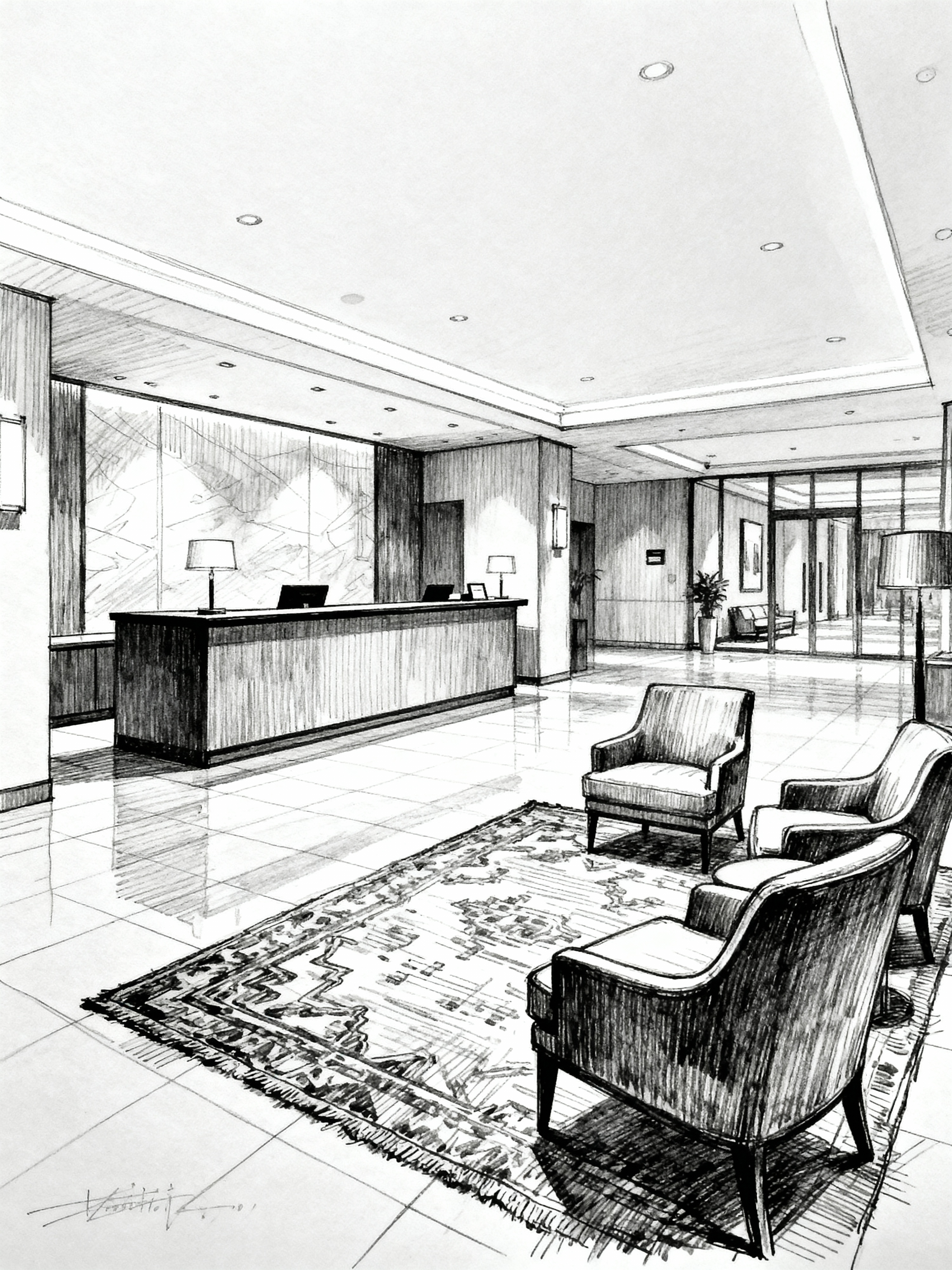 (hand-drawn monochrome black and white sketch line drawing)++ of sketch-style interior designed (hotel lobby) apartment interior. a sketch of interior. with . . a sketch of interior. with check in desk and lounge chairs and rug. trending on artstation. black and white line drawing sketch without colors.