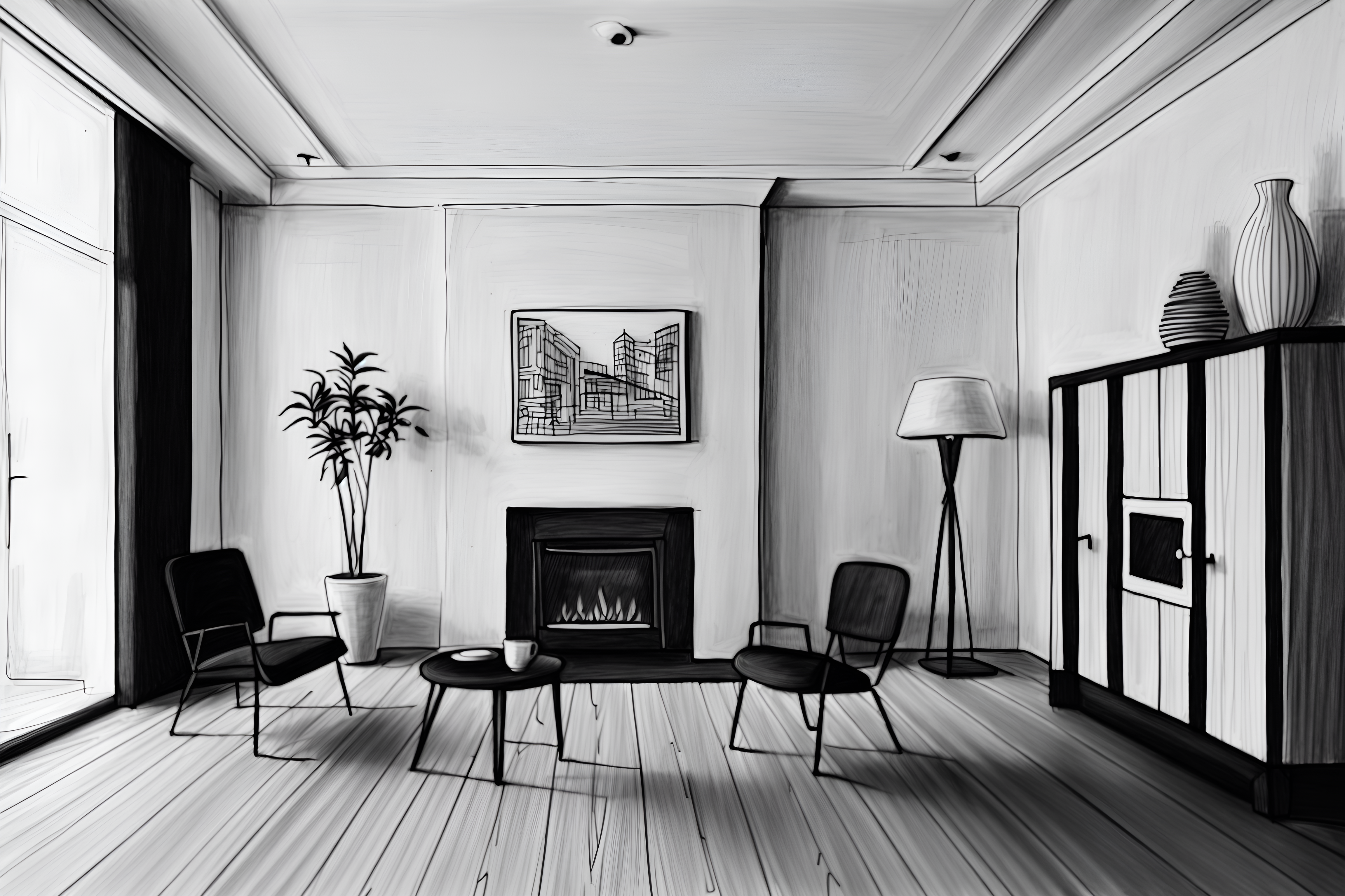 (hand-drawn monochrome black and white sketch line drawing)++ of sketch-style interior designed (kitchen living combo) apartment interior. a sketch of interior. with . a sketch of interior. with chairs and stove and plant. trending on artstation. black and white line drawing sketch without colors. masterpiece, cinematic light, ultrarealistic+, photorealistic+, 8k, raw photo, realistic, sharp focus on eyes, (symmetrical eyes), (intact eyes), hyperrealistic, highest quality, best quality, , highly detailed, masterpiece, best quality, extremely detailed 8k wallpaper, masterpiece, best quality, ultra-detailed, best shadow, detailed background, detailed face, detailed eyes, high contrast, best illumination, detailed face, dulux, caustic, dynamic angle, detailed glow. dramatic lighting. highly detailed, insanely detailed hair, symmetrical, intricate details, professionally retouched, 8k high definition. strong bokeh. award winning photo.