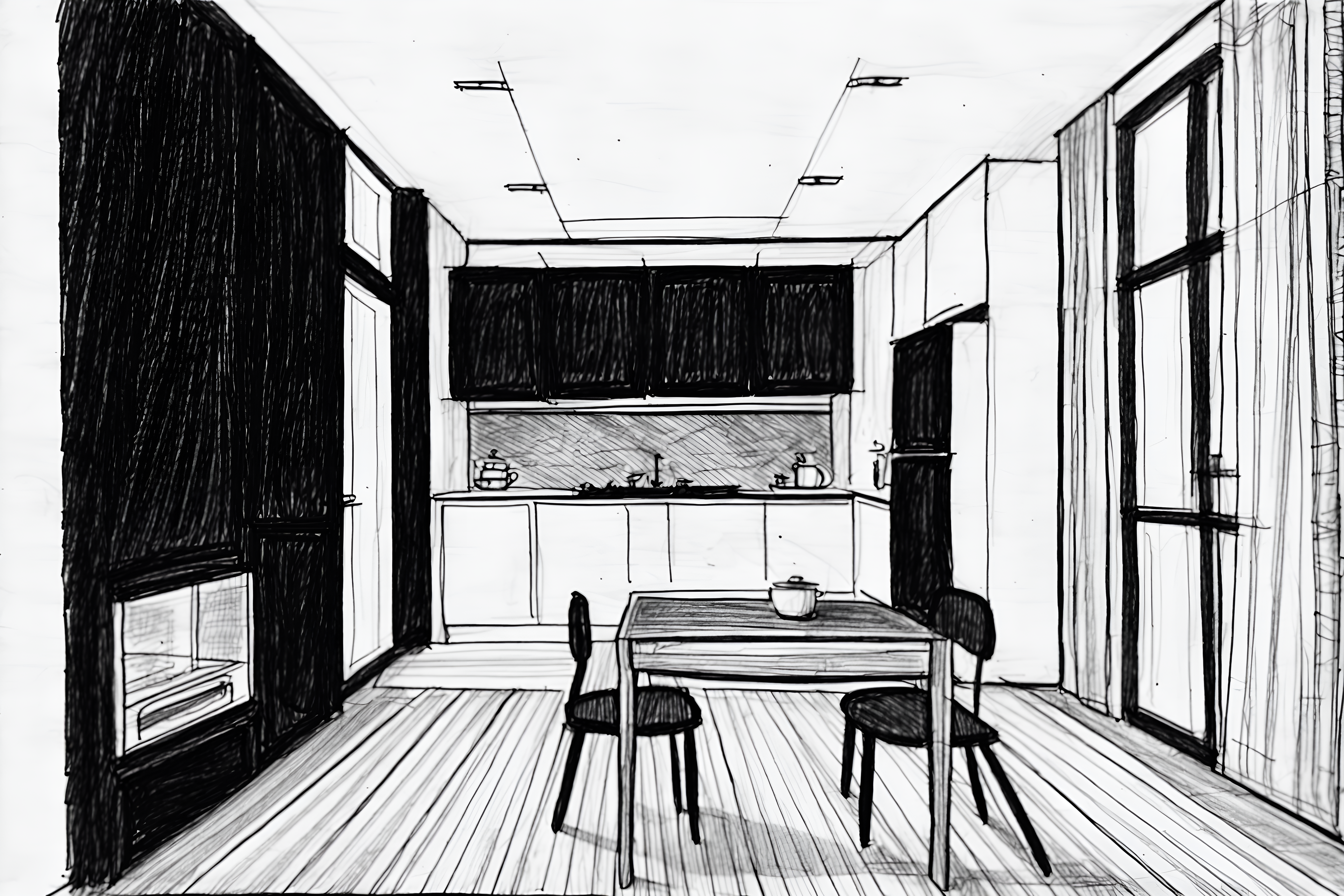 (hand-drawn monochrome black and white sketch line drawing)++ of sketch-style interior designed (kitchen living combo) apartment interior. a sketch of interior. with . a sketch of interior. with chairs and stove and plant. trending on artstation. black and white line drawing sketch without colors. masterpiece, cinematic light, ultrarealistic+, photorealistic+, 8k, raw photo, realistic, sharp focus on eyes, (symmetrical eyes), (intact eyes), hyperrealistic, highest quality, best quality, , highly detailed, masterpiece, best quality, extremely detailed 8k wallpaper, masterpiece, best quality, ultra-detailed, best shadow, detailed background, detailed face, detailed eyes, high contrast, best illumination, detailed face, dulux, caustic, dynamic angle, detailed glow. dramatic lighting. highly detailed, insanely detailed hair, symmetrical, intricate details, professionally retouched, 8k high definition. strong bokeh. award winning photo.