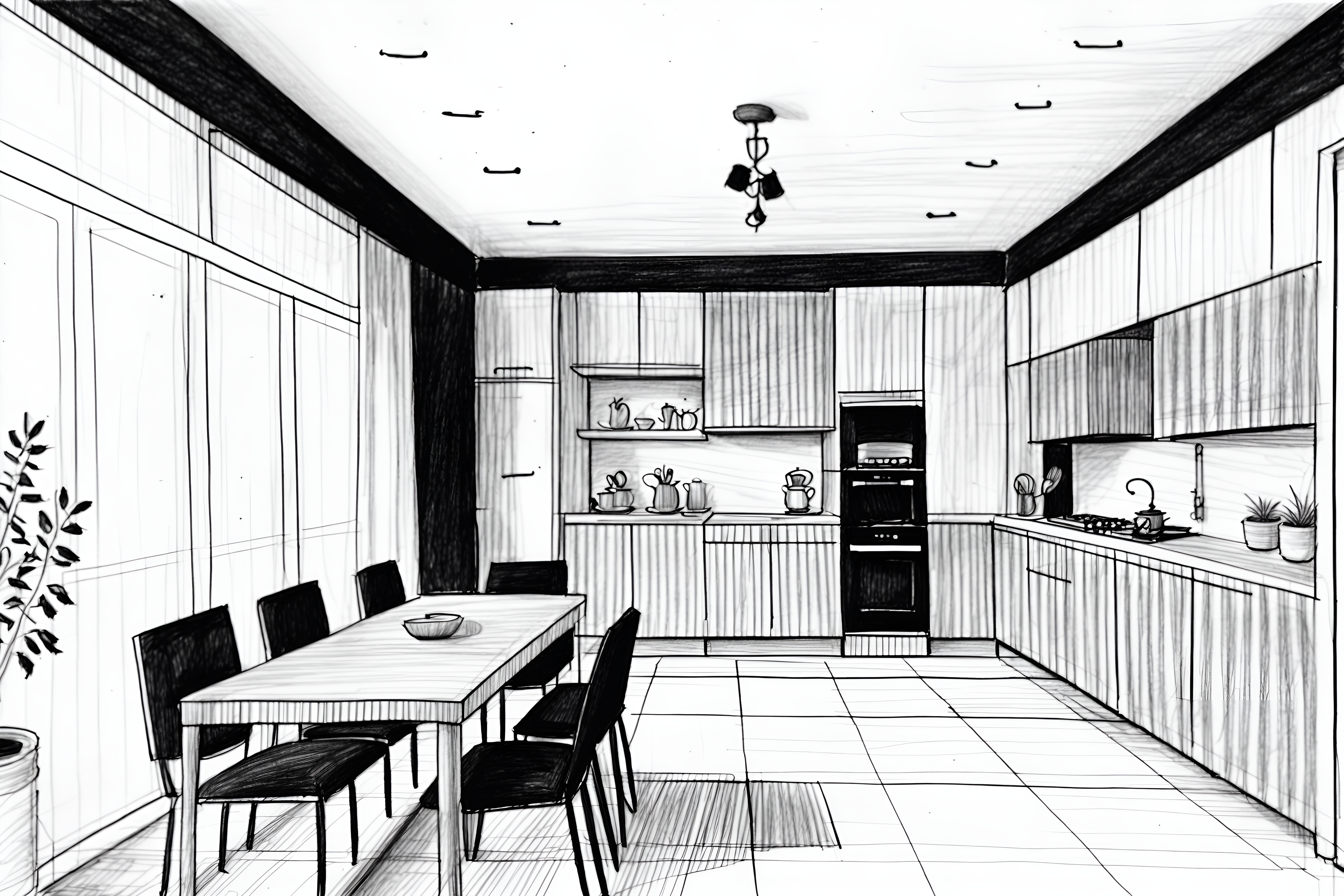 (hand-drawn monochrome black and white sketch line drawing)++ of sketch-style interior designed (kitchen living combo) apartment interior. a sketch of interior. with . a sketch of interior. with chairs and stove and plant. trending on artstation. black and white line drawing sketch without colors. masterpiece, cinematic light, ultrarealistic+, photorealistic+, 8k, raw photo, realistic, sharp focus on eyes, (symmetrical eyes), (intact eyes), hyperrealistic, highest quality, best quality, , highly detailed, masterpiece, best quality, extremely detailed 8k wallpaper, masterpiece, best quality, ultra-detailed, best shadow, detailed background, detailed face, detailed eyes, high contrast, best illumination, detailed face, dulux, caustic, dynamic angle, detailed glow. dramatic lighting. highly detailed, insanely detailed hair, symmetrical, intricate details, professionally retouched, 8k high definition. strong bokeh. award winning photo.