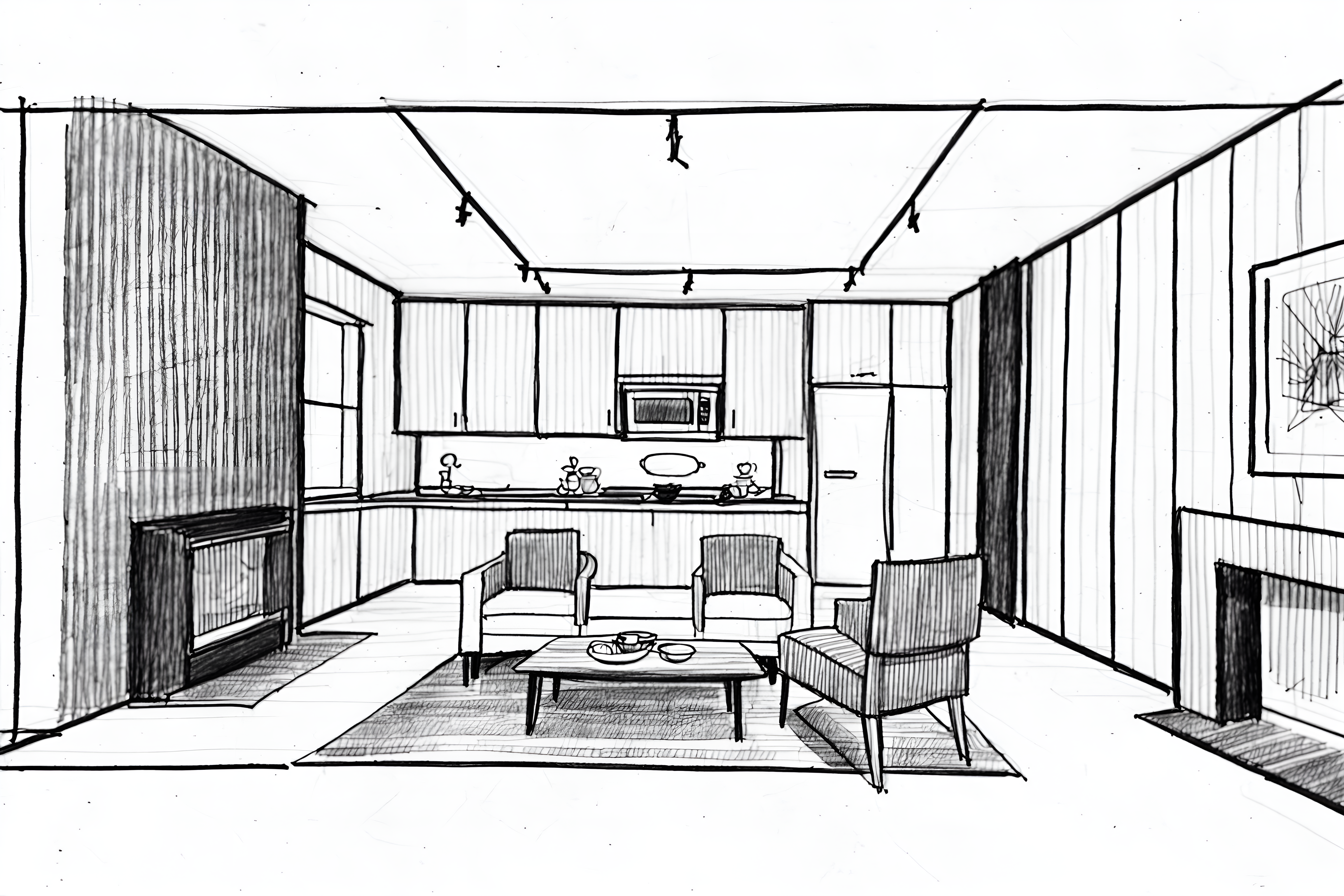 (hand-drawn monochrome black and white sketch line drawing)++ of sketch-style interior designed (kitchen living combo) apartment interior. a sketch of interior. with . a sketch of interior. with chairs and stove and plant. trending on artstation. black and white line drawing sketch without colors. masterpiece, cinematic light, ultrarealistic+, photorealistic+, 8k, raw photo, realistic, sharp focus on eyes, (symmetrical eyes), (intact eyes), hyperrealistic, highest quality, best quality, , highly detailed, masterpiece, best quality, extremely detailed 8k wallpaper, masterpiece, best quality, ultra-detailed, best shadow, detailed background, detailed face, detailed eyes, high contrast, best illumination, detailed face, dulux, caustic, dynamic angle, detailed glow. dramatic lighting. highly detailed, insanely detailed hair, symmetrical, intricate details, professionally retouched, 8k high definition. strong bokeh. award winning photo.