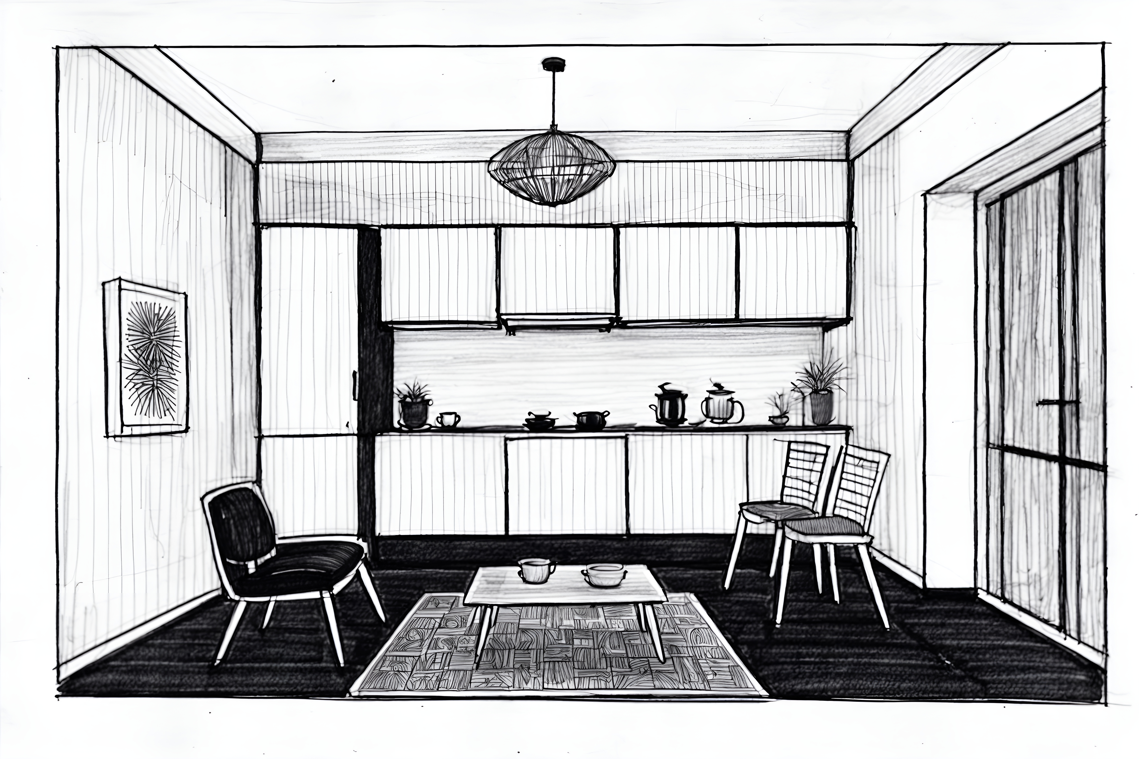 (hand-drawn monochrome black and white sketch line drawing)++ of sketch-style interior designed (kitchen living combo) apartment interior. a sketch of interior. with . a sketch of interior. with chairs and stove and plant. trending on artstation. black and white line drawing sketch without colors. masterpiece, cinematic light, ultrarealistic+, photorealistic+, 8k, raw photo, realistic, sharp focus on eyes, (symmetrical eyes), (intact eyes), hyperrealistic, highest quality, best quality, , highly detailed, masterpiece, best quality, extremely detailed 8k wallpaper, masterpiece, best quality, ultra-detailed, best shadow, detailed background, detailed face, detailed eyes, high contrast, best illumination, detailed face, dulux, caustic, dynamic angle, detailed glow. dramatic lighting. highly detailed, insanely detailed hair, symmetrical, intricate details, professionally retouched, 8k high definition. strong bokeh. award winning photo.