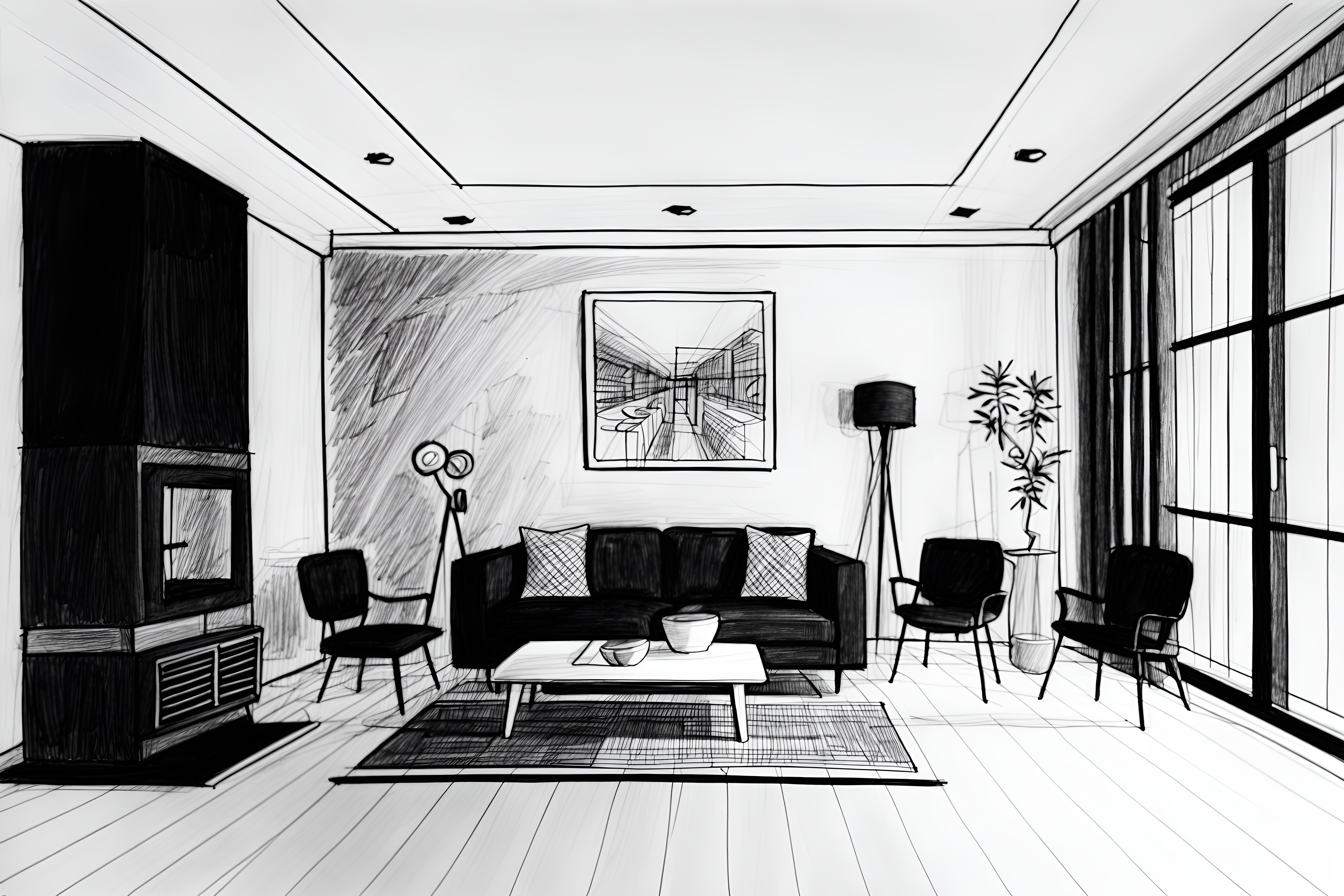 (hand-drawn monochrome black and white sketch line drawing)++ of sketch-style interior designed (kitchen living combo) apartment interior. a sketch of interior. with . a sketch of interior. with chairs and stove and plant. trending on artstation. black and white line drawing sketch without colors. masterpiece, cinematic light, ultrarealistic+, photorealistic+, 8k, raw photo, realistic, sharp focus on eyes, (symmetrical eyes), (intact eyes), hyperrealistic, highest quality, best quality, , highly detailed, masterpiece, best quality, extremely detailed 8k wallpaper, masterpiece, best quality, ultra-detailed, best shadow, detailed background, detailed face, detailed eyes, high contrast, best illumination, detailed face, dulux, caustic, dynamic angle, detailed glow. dramatic lighting. highly detailed, insanely detailed hair, symmetrical, intricate details, professionally retouched, 8k high definition. strong bokeh. award winning photo.