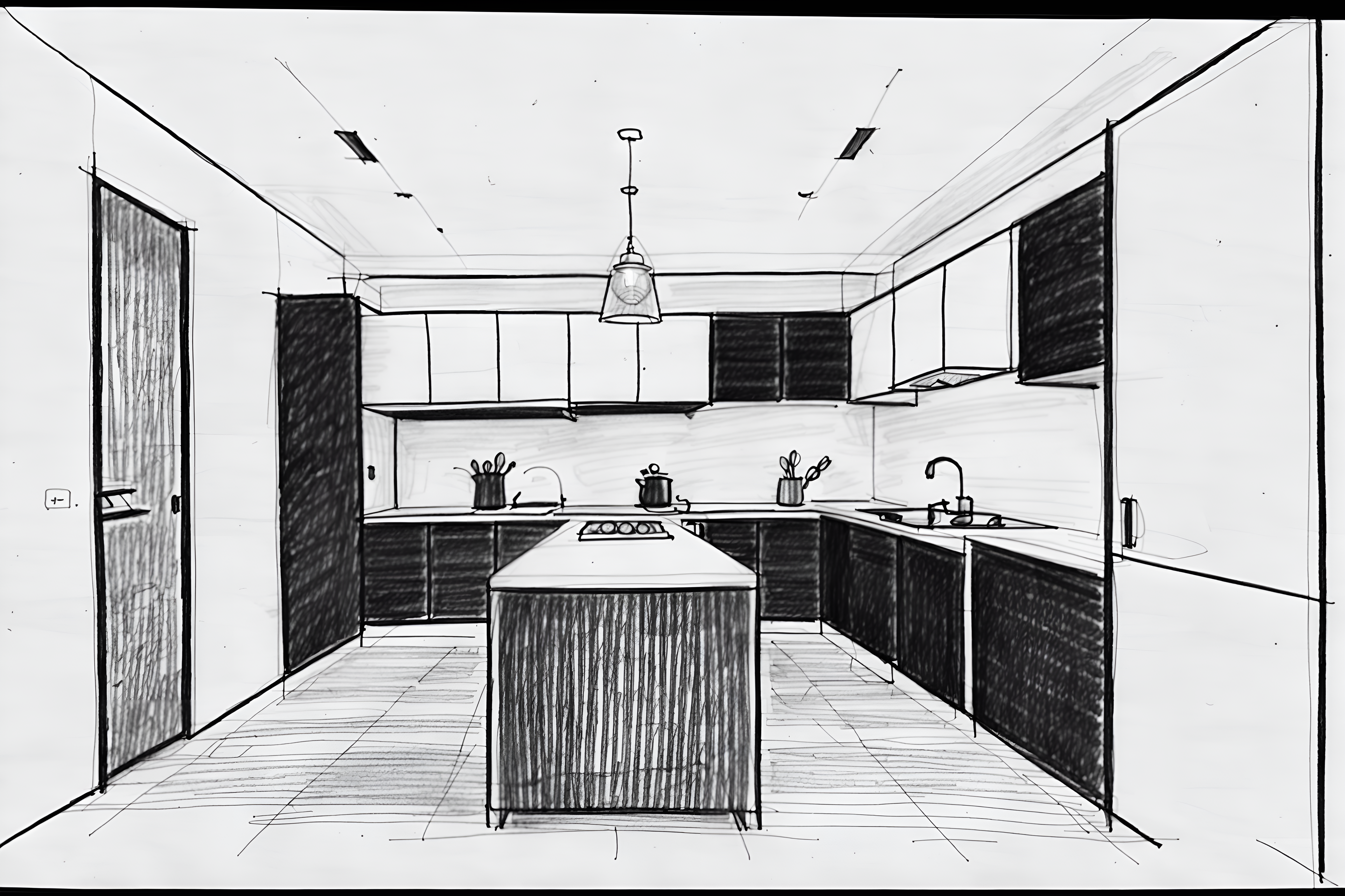 (hand-drawn monochrome black and white sketch line drawing)++ of sketch-style interior designed (kitchen) apartment interior. a sketch of interior. with . . a sketch of interior. with sink and kitchen cabinets and worktops. trending on artstation. black and white line drawing sketch without colors. masterpiece, cinematic light, ultrarealistic+, photorealistic+, 8k, raw photo, realistic, sharp focus on eyes, (symmetrical eyes), (intact eyes), hyperrealistic, highest quality, best quality, , highly detailed, masterpiece, best quality, extremely detailed 8k wallpaper, masterpiece, best quality, ultra-detailed, best shadow, detailed background, detailed face, detailed eyes, high contrast, best illumination, detailed face, dulux, caustic, dynamic angle, detailed glow. dramatic lighting. highly detailed, insanely detailed hair, symmetrical, intricate details, professionally retouched, 8k high definition. strong bokeh. award winning photo.