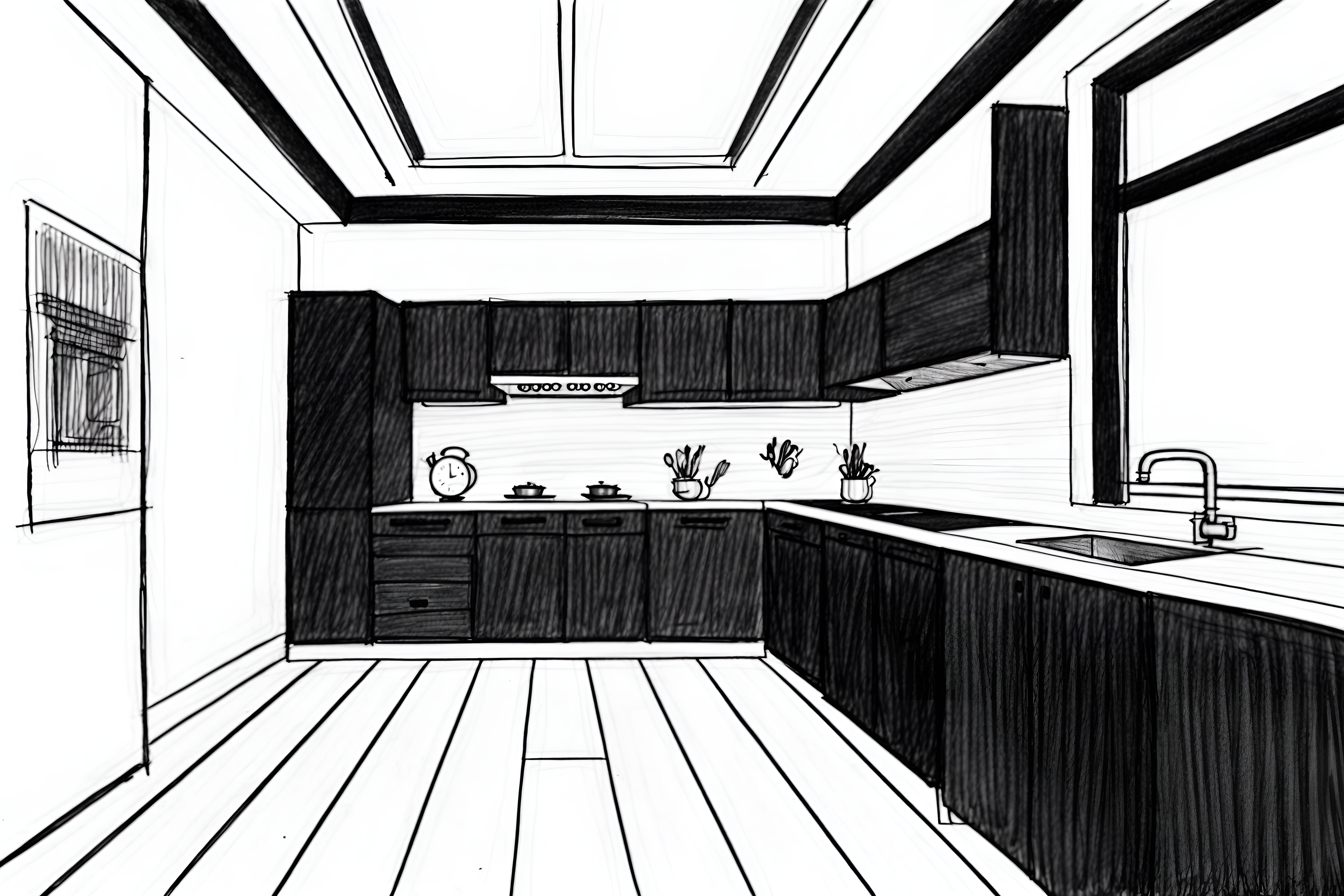(hand-drawn monochrome black and white sketch line drawing)++ of sketch-style interior designed (kitchen) apartment interior. a sketch of interior. with . . a sketch of interior. with sink and kitchen cabinets and worktops. trending on artstation. black and white line drawing sketch without colors. masterpiece, cinematic light, ultrarealistic+, photorealistic+, 8k, raw photo, realistic, sharp focus on eyes, (symmetrical eyes), (intact eyes), hyperrealistic, highest quality, best quality, , highly detailed, masterpiece, best quality, extremely detailed 8k wallpaper, masterpiece, best quality, ultra-detailed, best shadow, detailed background, detailed face, detailed eyes, high contrast, best illumination, detailed face, dulux, caustic, dynamic angle, detailed glow. dramatic lighting. highly detailed, insanely detailed hair, symmetrical, intricate details, professionally retouched, 8k high definition. strong bokeh. award winning photo.