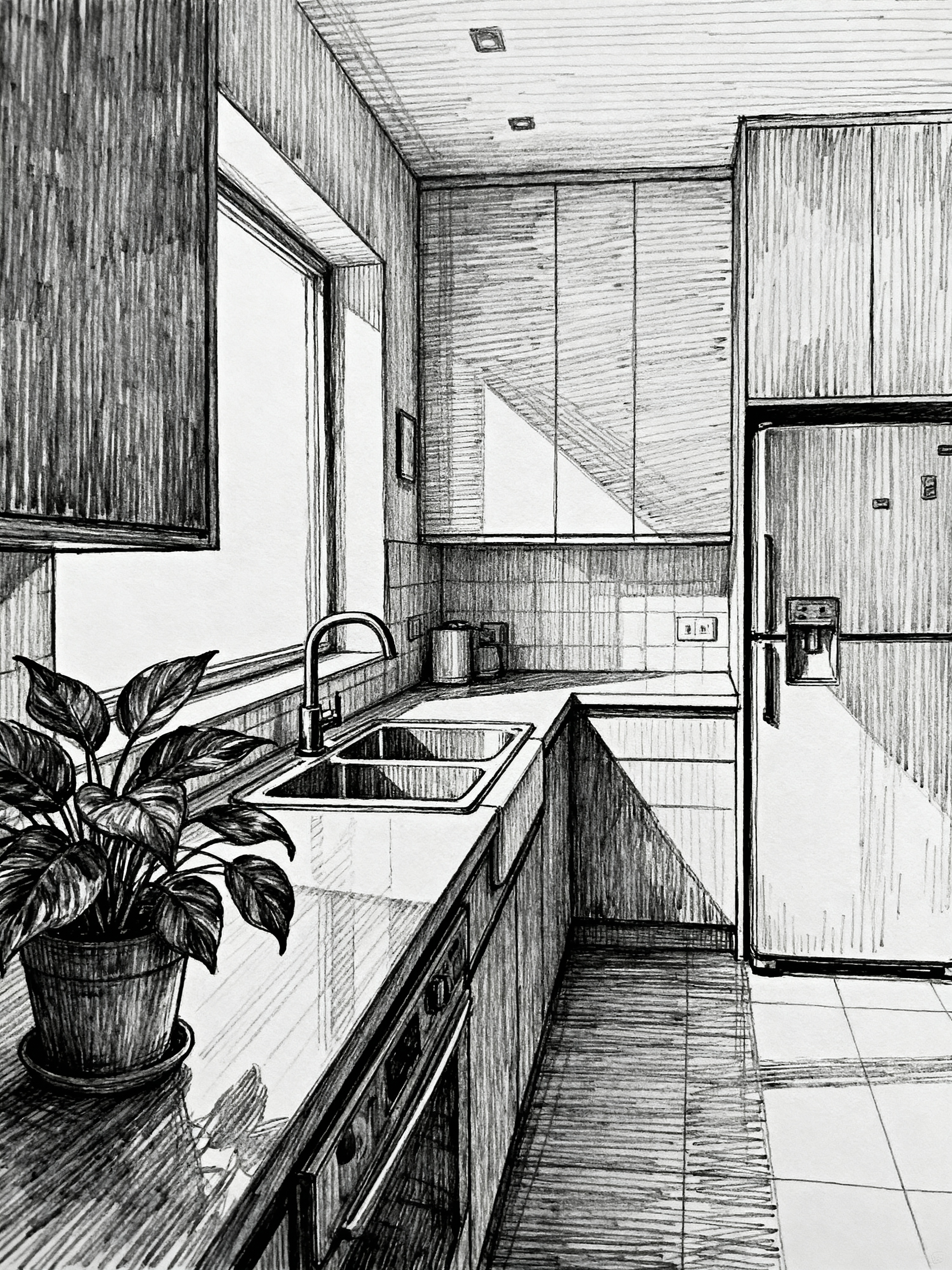 (hand-drawn monochrome black and white sketch line drawing)++ of sketch-style interior designed (kitchen) apartment interior. a sketch of interior. with . . a sketch of interior. with plant and sink and refrigerator. trending on artstation. black and white line drawing sketch without colors.