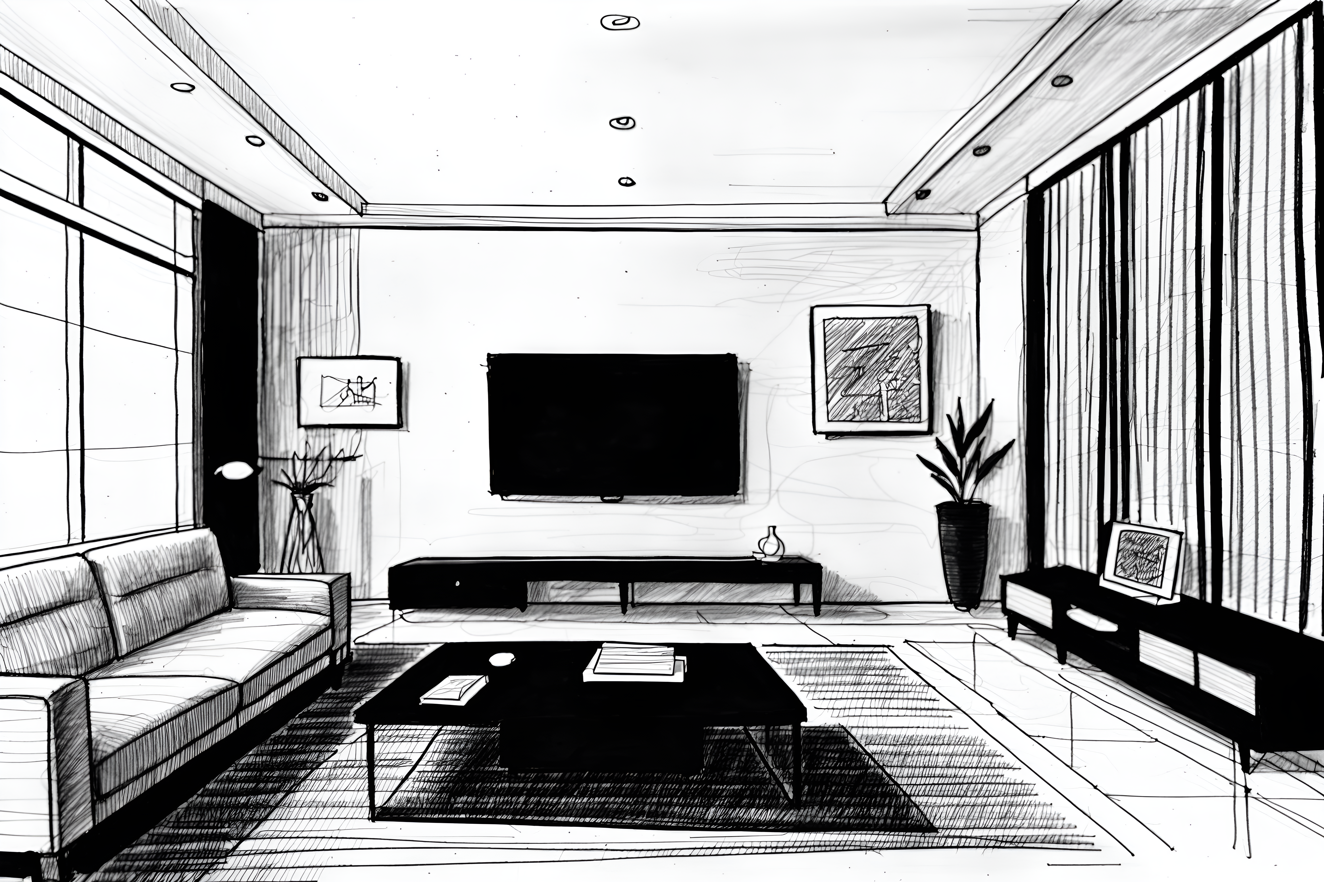 (hand-drawn monochrome black and white sketch line drawing)++ of sketch-style interior designed (living room) apartment interior. a sketch of interior. with . . a sketch of interior. with televisions and plant and occasional tables. trending on artstation. black and white line drawing sketch without colors. masterpiece, cinematic light, ultrarealistic+, photorealistic+, 8k, raw photo, realistic, sharp focus on eyes, (symmetrical eyes), (intact eyes), hyperrealistic, highest quality, best quality, , highly detailed, masterpiece, best quality, extremely detailed 8k wallpaper, masterpiece, best quality, ultra-detailed, best shadow, detailed background, detailed face, detailed eyes, high contrast, best illumination, detailed face, dulux, caustic, dynamic angle, detailed glow. dramatic lighting. highly detailed, insanely detailed hair, symmetrical, intricate details, professionally retouched, 8k high definition. strong bokeh. award winning photo.