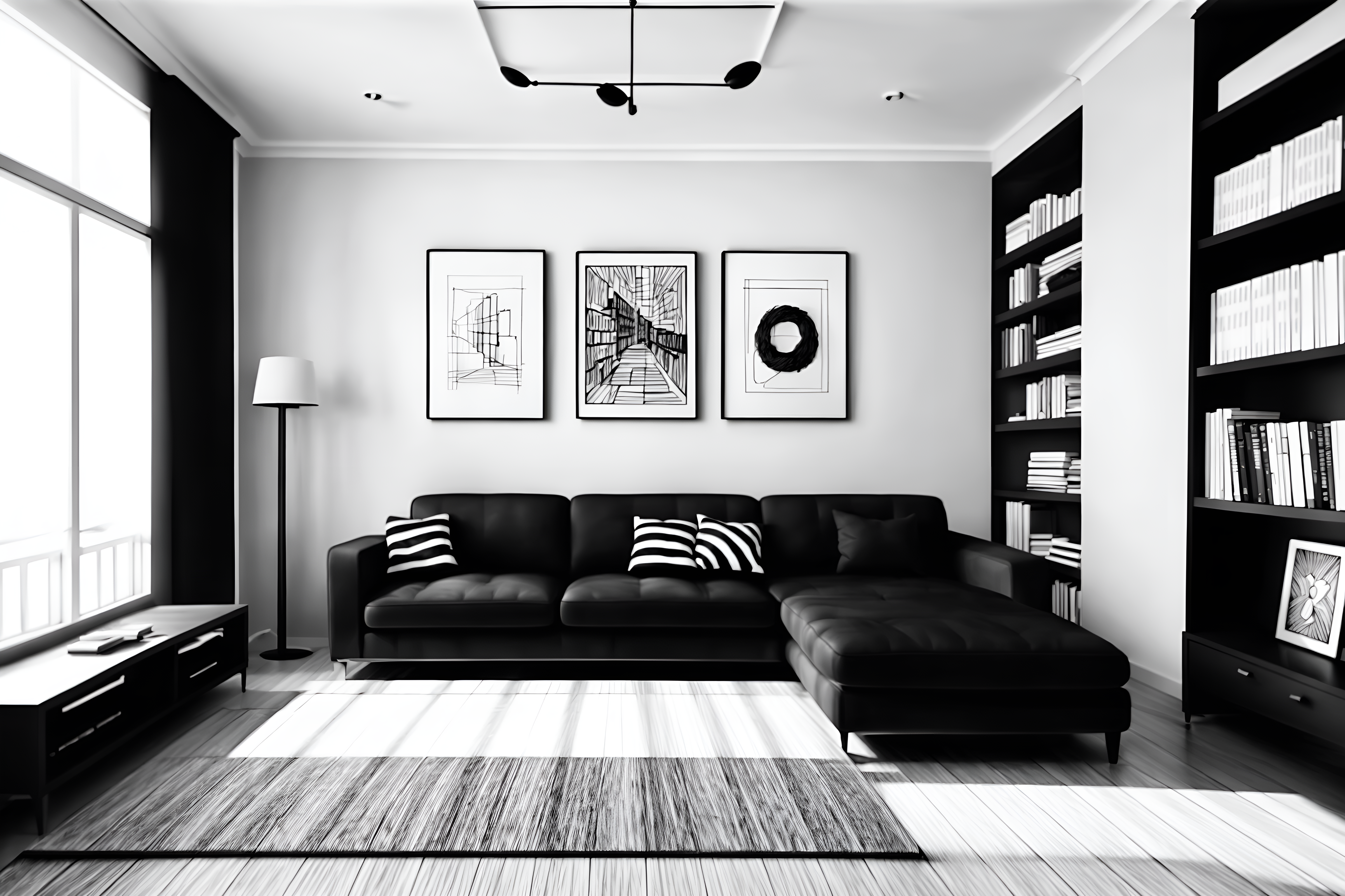 (hand-drawn monochrome black and white sketch line drawing)++ of sketch-style interior designed (living room) apartment interior. a sketch of interior. with . a sketch of interior. with bookshelves and televisions and coffee tables. trending on artstation. black and white line drawing sketch without colors. masterpiece, cinematic light, ultrarealistic+, photorealistic+, 8k, raw photo, realistic, sharp focus on eyes, (symmetrical eyes), (intact eyes), hyperrealistic, highest quality, best quality, , highly detailed, masterpiece, best quality, extremely detailed 8k wallpaper, masterpiece, best quality, ultra-detailed, best shadow, detailed background, detailed face, detailed eyes, high contrast, best illumination, detailed face, dulux, caustic, dynamic angle, detailed glow. dramatic lighting. highly detailed, insanely detailed hair, symmetrical, intricate details, professionally retouched, 8k high definition. strong bokeh. award winning photo.