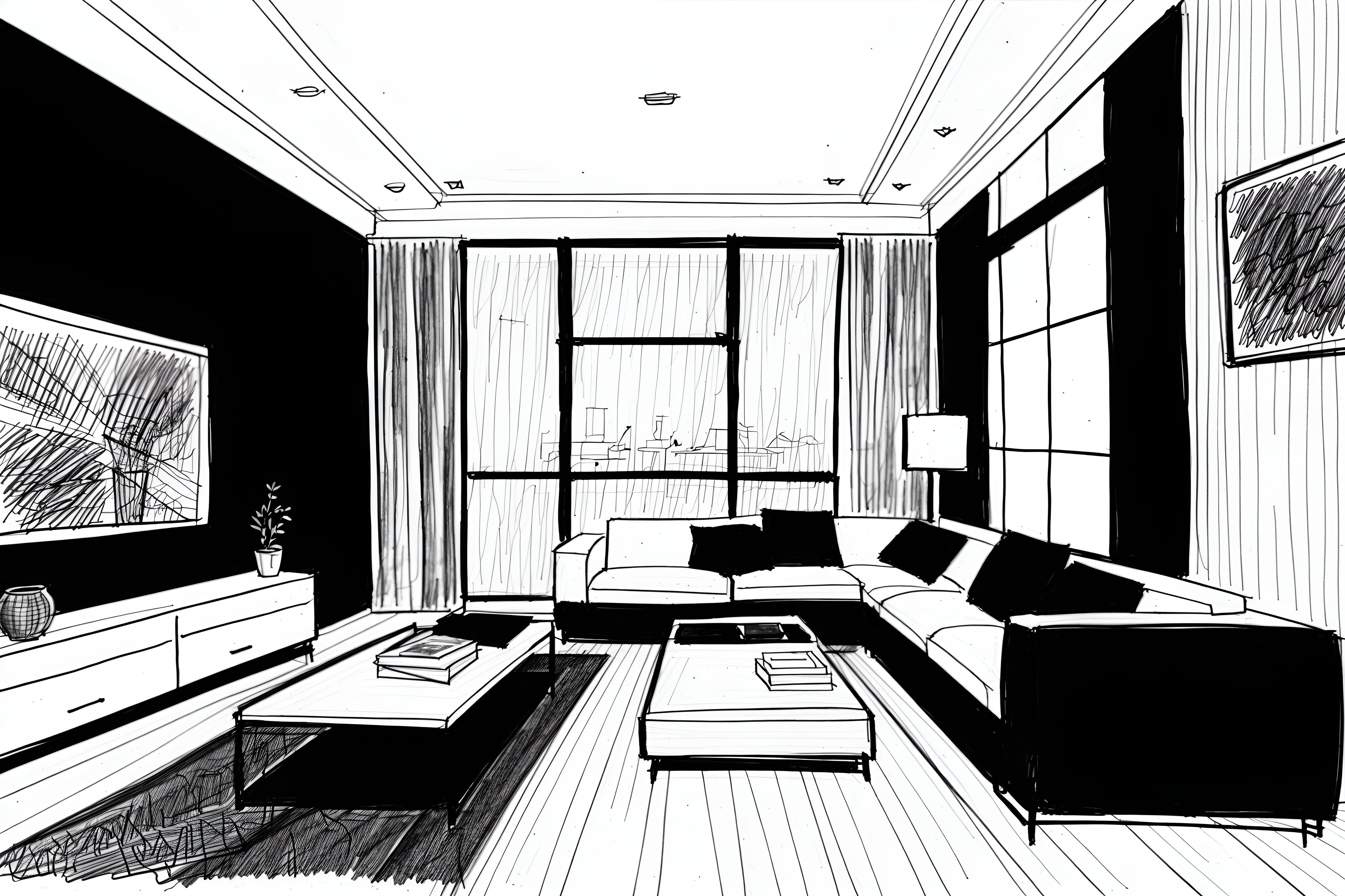 (hand-drawn monochrome black and white sketch line drawing)++ of sketch-style interior designed (living room) apartment interior. a sketch of interior. with . . a sketch of interior. with televisions and plant and occasional tables. trending on artstation. black and white line drawing sketch without colors. masterpiece, cinematic light, ultrarealistic+, photorealistic+, 8k, raw photo, realistic, sharp focus on eyes, (symmetrical eyes), (intact eyes), hyperrealistic, highest quality, best quality, , highly detailed, masterpiece, best quality, extremely detailed 8k wallpaper, masterpiece, best quality, ultra-detailed, best shadow, detailed background, detailed face, detailed eyes, high contrast, best illumination, detailed face, dulux, caustic, dynamic angle, detailed glow. dramatic lighting. highly detailed, insanely detailed hair, symmetrical, intricate details, professionally retouched, 8k high definition. strong bokeh. award winning photo.