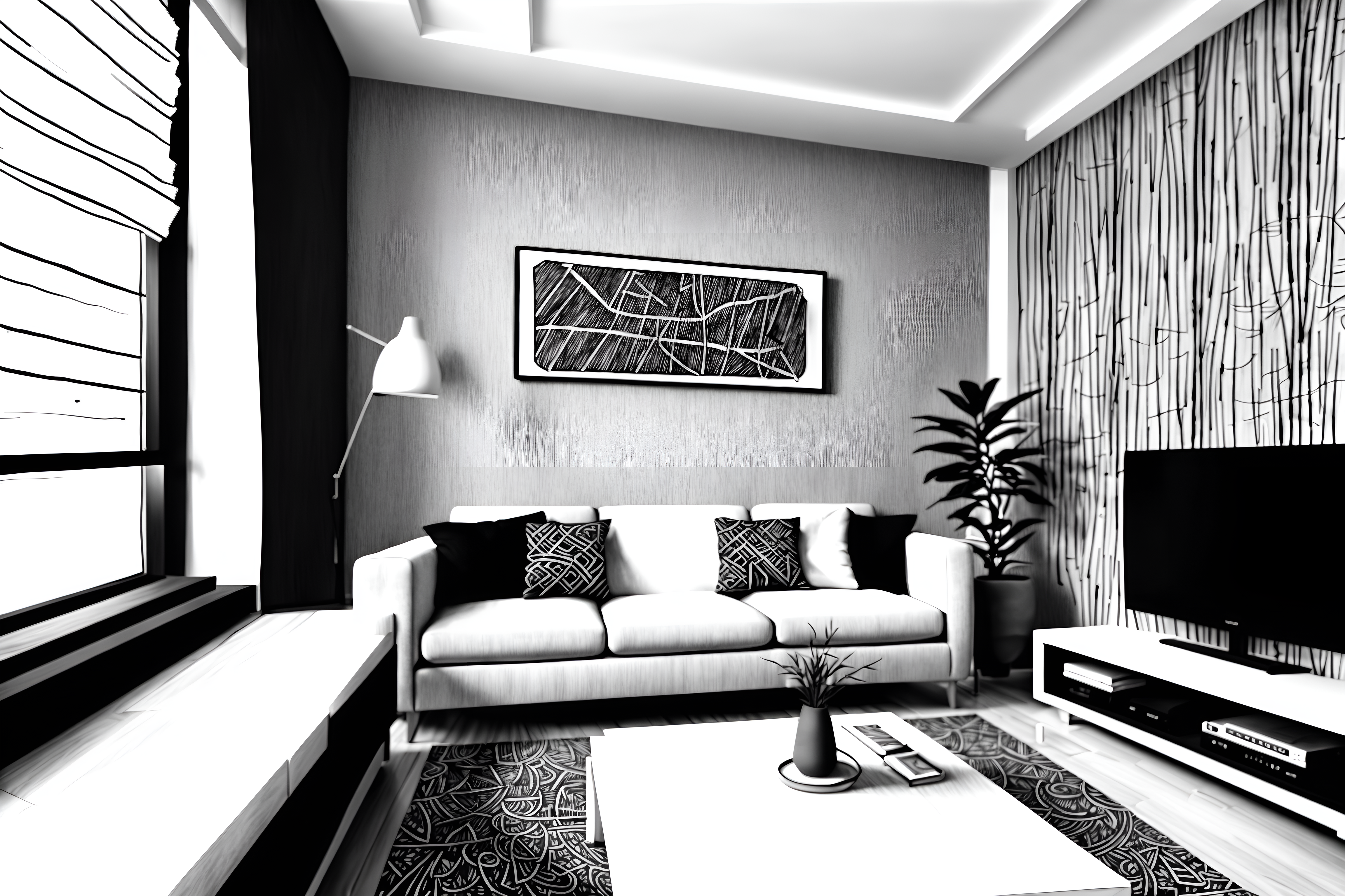 (hand-drawn monochrome black and white sketch line drawing)++ of sketch-style interior designed (living room) apartment interior. a sketch of interior. with . . a sketch of interior. with televisions and plant and occasional tables. trending on artstation. black and white line drawing sketch without colors. masterpiece, cinematic light, ultrarealistic+, photorealistic+, 8k, raw photo, realistic, sharp focus on eyes, (symmetrical eyes), (intact eyes), hyperrealistic, highest quality, best quality, , highly detailed, masterpiece, best quality, extremely detailed 8k wallpaper, masterpiece, best quality, ultra-detailed, best shadow, detailed background, detailed face, detailed eyes, high contrast, best illumination, detailed face, dulux, caustic, dynamic angle, detailed glow. dramatic lighting. highly detailed, insanely detailed hair, symmetrical, intricate details, professionally retouched, 8k high definition. strong bokeh. award winning photo.