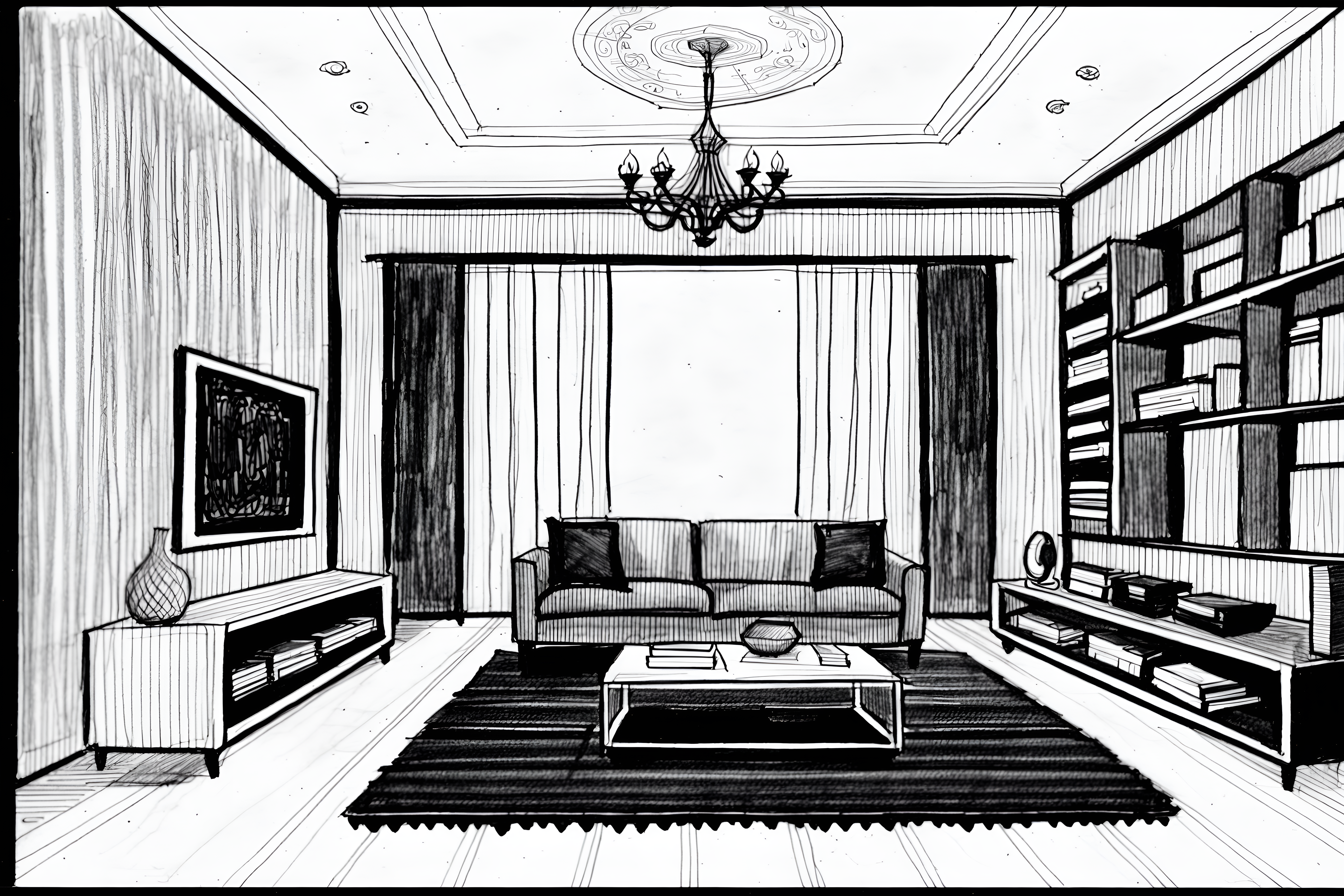 (hand-drawn monochrome black and white sketch line drawing)++ of sketch-style interior designed (living room) apartment interior. a sketch of interior. with . a sketch of interior. with bookshelves and televisions and coffee tables. trending on artstation. black and white line drawing sketch without colors. masterpiece, cinematic light, ultrarealistic+, photorealistic+, 8k, raw photo, realistic, sharp focus on eyes, (symmetrical eyes), (intact eyes), hyperrealistic, highest quality, best quality, , highly detailed, masterpiece, best quality, extremely detailed 8k wallpaper, masterpiece, best quality, ultra-detailed, best shadow, detailed background, detailed face, detailed eyes, high contrast, best illumination, detailed face, dulux, caustic, dynamic angle, detailed glow. dramatic lighting. highly detailed, insanely detailed hair, symmetrical, intricate details, professionally retouched, 8k high definition. strong bokeh. award winning photo.