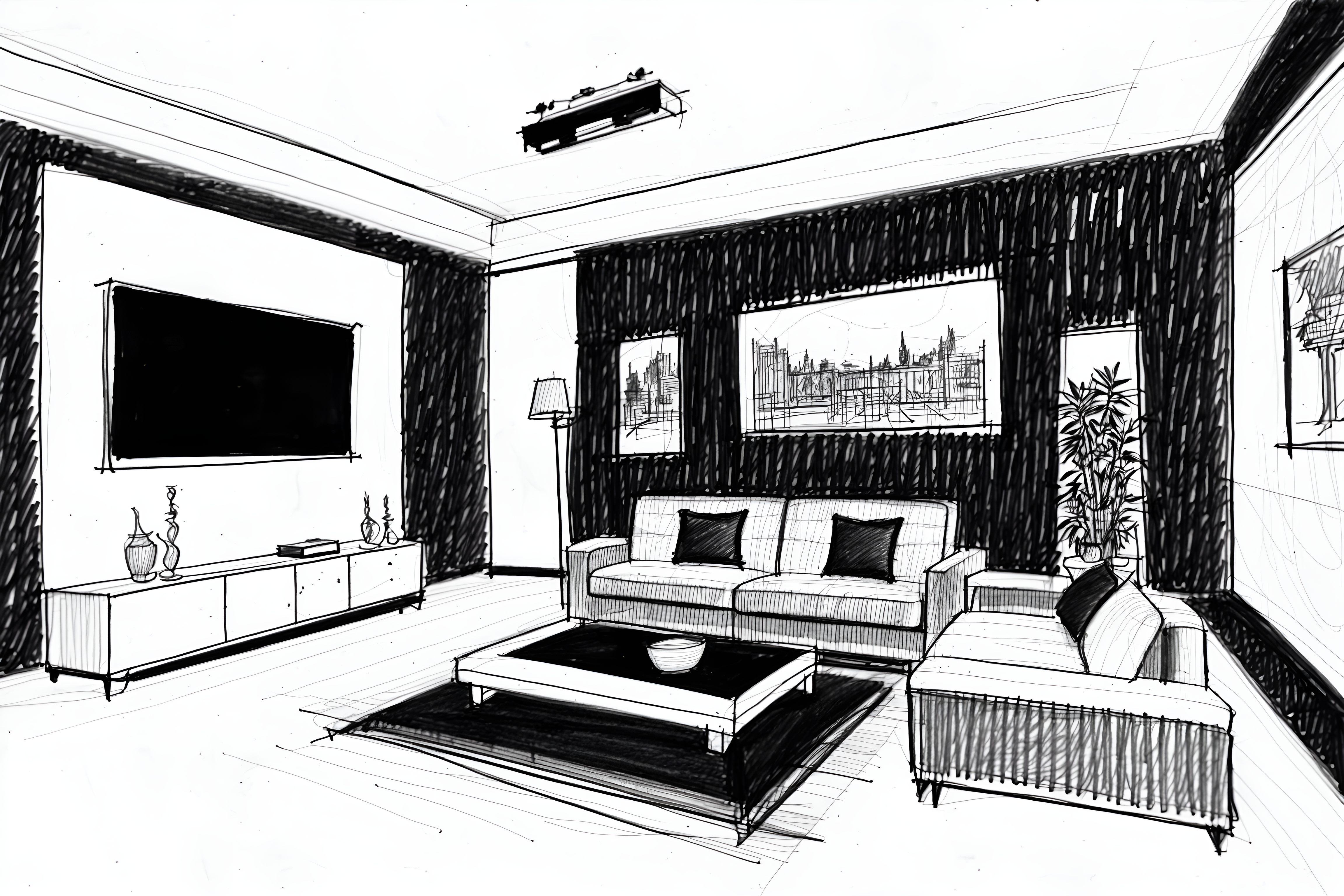(hand-drawn monochrome black and white sketch line drawing)++ of sketch-style interior designed (living room) apartment interior. a sketch of interior. with . . a sketch of interior. with televisions and plant and occasional tables. trending on artstation. black and white line drawing sketch without colors. masterpiece, cinematic light, ultrarealistic+, photorealistic+, 8k, raw photo, realistic, sharp focus on eyes, (symmetrical eyes), (intact eyes), hyperrealistic, highest quality, best quality, , highly detailed, masterpiece, best quality, extremely detailed 8k wallpaper, masterpiece, best quality, ultra-detailed, best shadow, detailed background, detailed face, detailed eyes, high contrast, best illumination, detailed face, dulux, caustic, dynamic angle, detailed glow. dramatic lighting. highly detailed, insanely detailed hair, symmetrical, intricate details, professionally retouched, 8k high definition. strong bokeh. award winning photo.