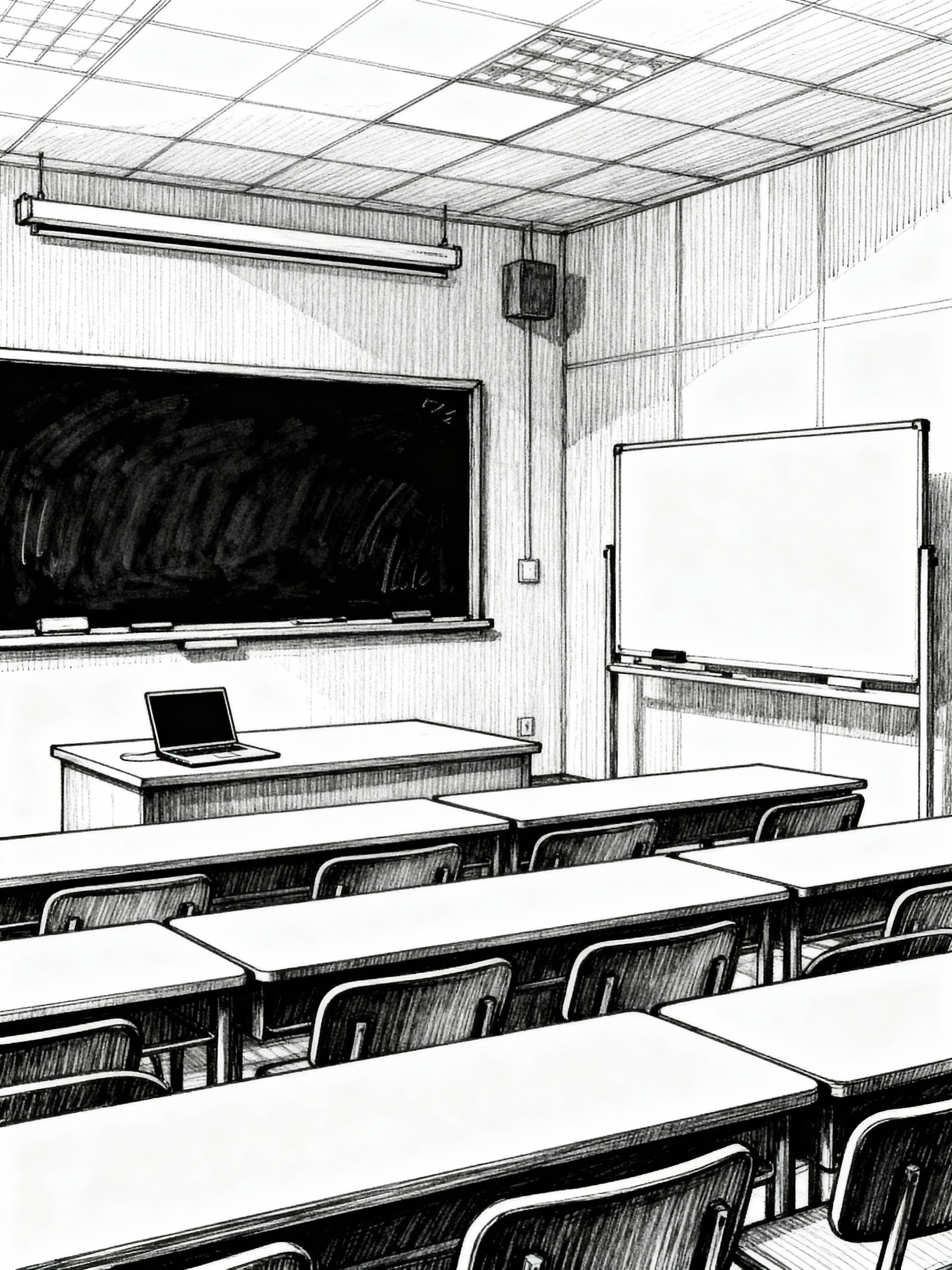 (hand-drawn monochrome black and white sketch line drawing)++ of sketch-style interior designed (lecture hall) apartment interior. a sketch of interior. with . . a sketch of interior. with chalkboard and laptop and whiteboard. trending on artstation. black and white line drawing sketch without colors.