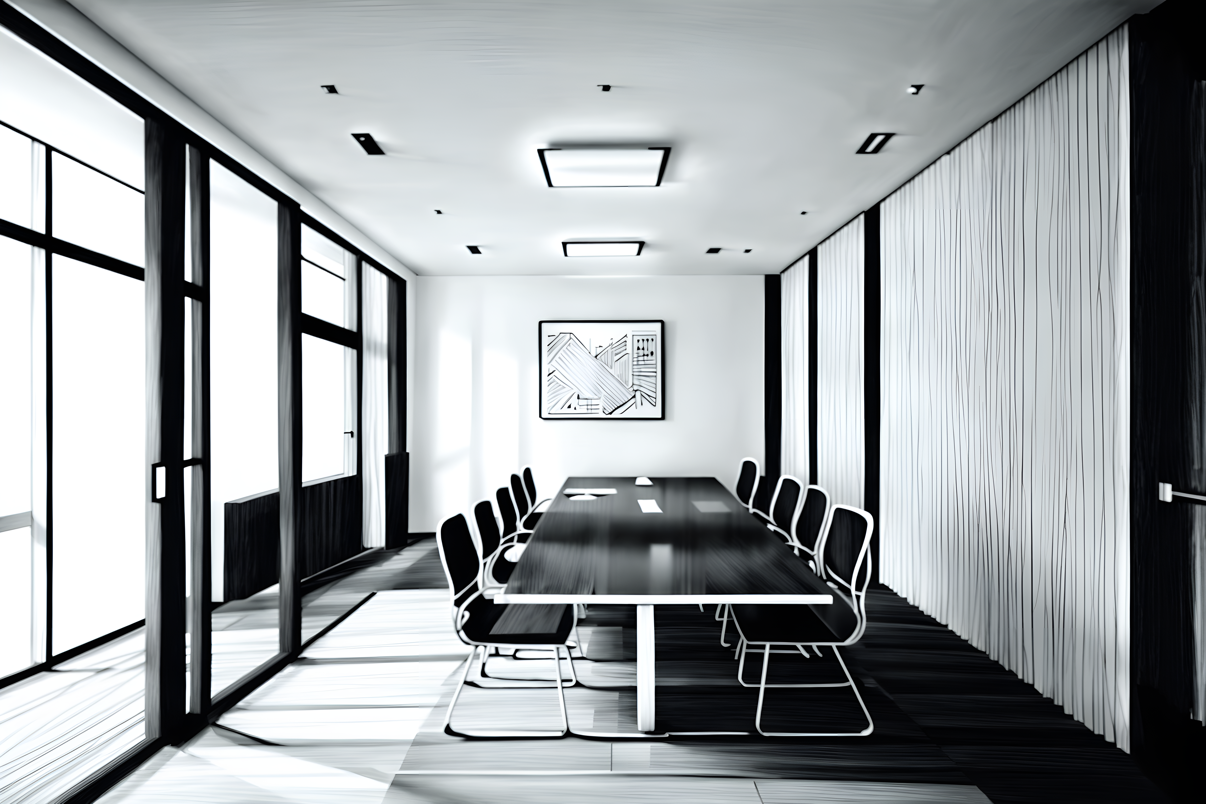(hand-drawn monochrome black and white sketch line drawing)++ of sketch-style interior designed (meeting room) apartment interior. a sketch of interior. with . . a sketch of interior. with glass walls and glass doors and boardroom table. trending on artstation. black and white line drawing sketch without colors. masterpiece, cinematic light, ultrarealistic+, photorealistic+, 8k, raw photo, realistic, sharp focus on eyes, (symmetrical eyes), (intact eyes), hyperrealistic, highest quality, best quality, , highly detailed, masterpiece, best quality, extremely detailed 8k wallpaper, masterpiece, best quality, ultra-detailed, best shadow, detailed background, detailed face, detailed eyes, high contrast, best illumination, detailed face, dulux, caustic, dynamic angle, detailed glow. dramatic lighting. highly detailed, insanely detailed hair, symmetrical, intricate details, professionally retouched, 8k high definition. strong bokeh. award winning photo.