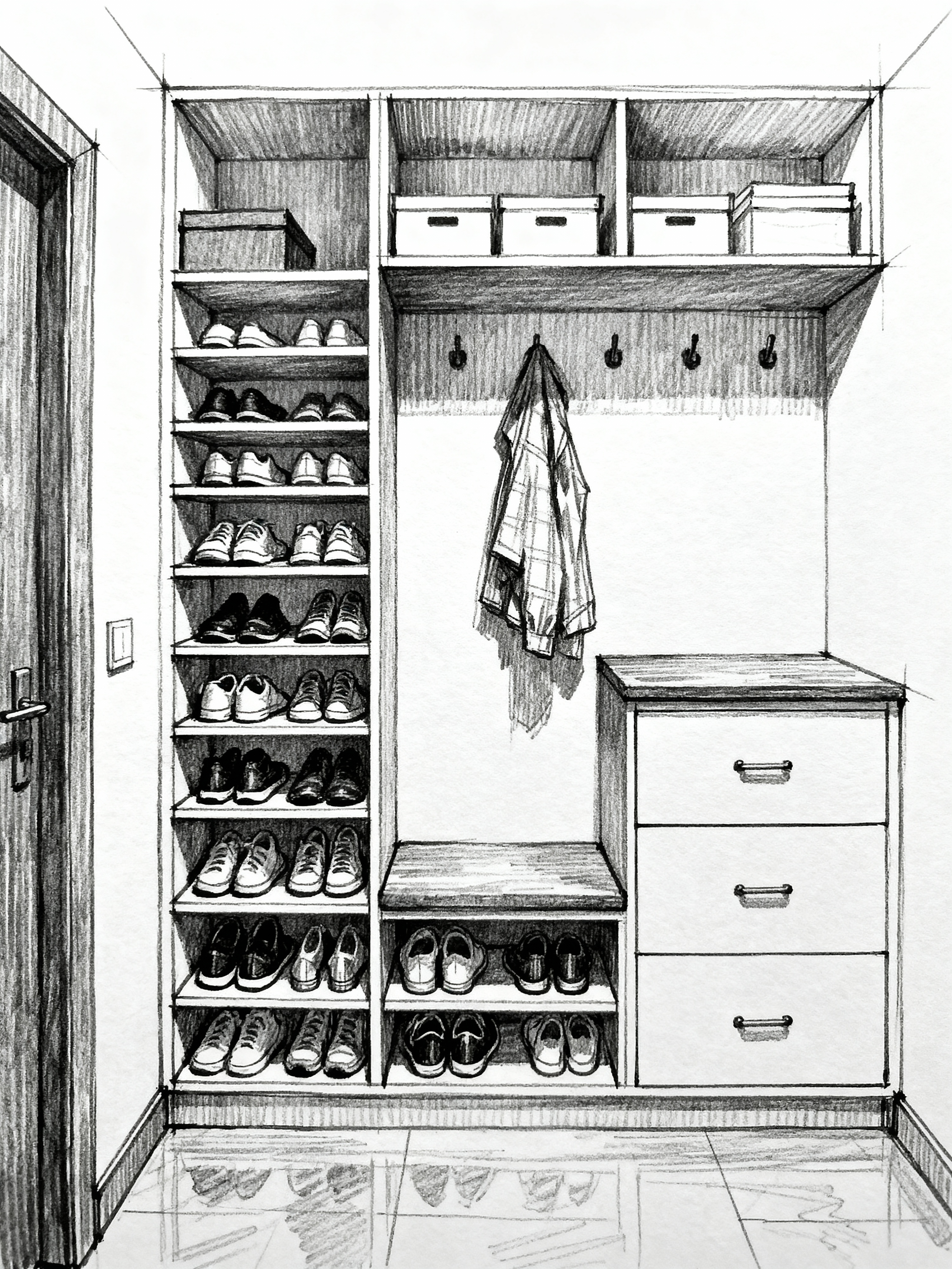 (hand-drawn monochrome black and white sketch line drawing)++ of sketch-style interior designed (mudroom) apartment interior. a sketch of interior. with . . a sketch of interior. with shelves for shoes and storage drawers and high up storage. trending on artstation. black and white line drawing sketch without colors.