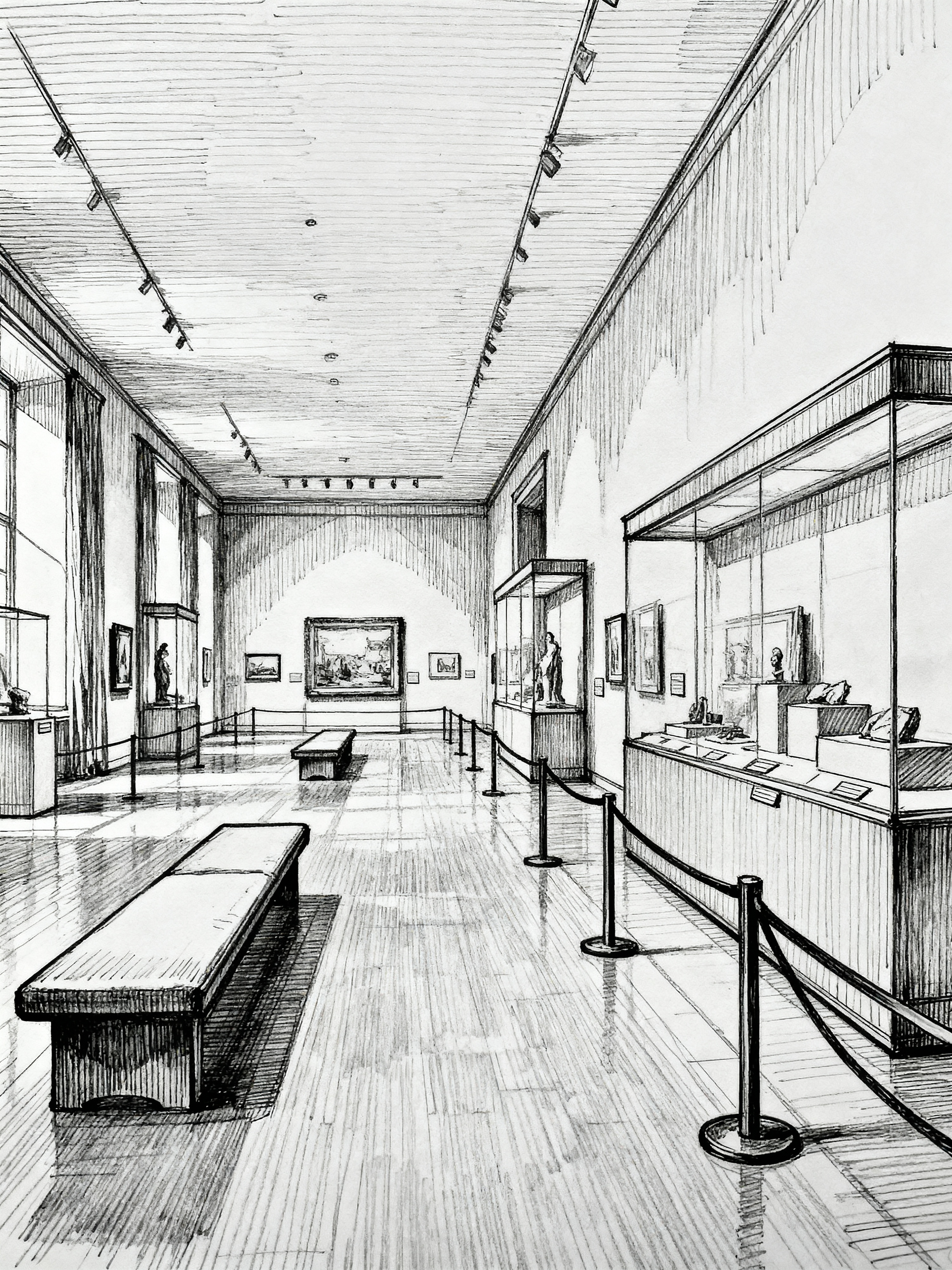 (hand-drawn monochrome black and white sketch line drawing)++ of sketch-style interior designed (museum hall) apartment interior. a sketch of interior. with . . a sketch of interior. with benches and barriers and display cases. trending on artstation. black and white line drawing sketch without colors.
