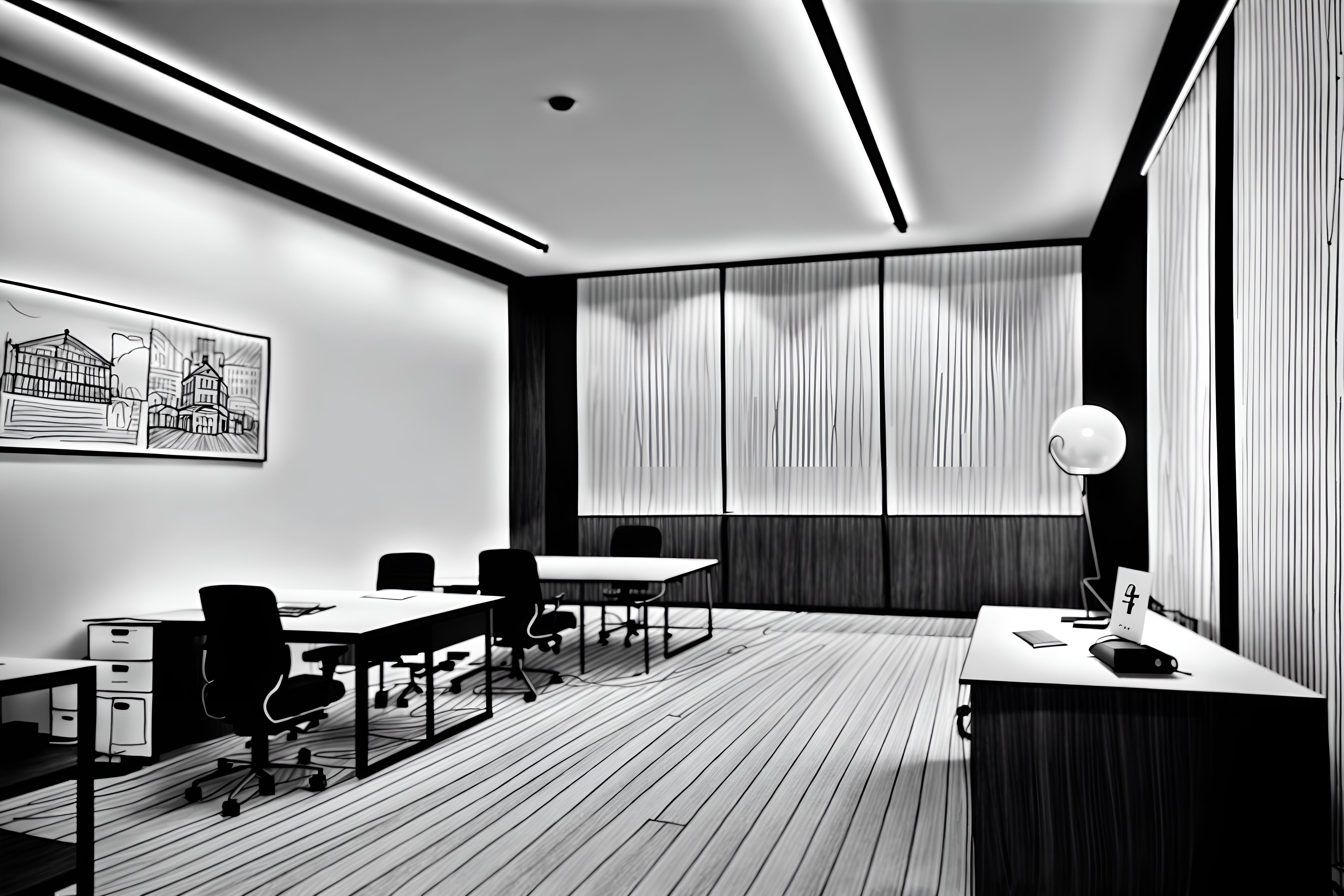 (hand-drawn monochrome black and white sketch line drawing)++ of sketch-style interior designed (office) apartment interior. a sketch of interior. with . . a sketch of interior. with desk lamps and office desks and office chairs. trending on artstation. black and white line drawing sketch without colors. masterpiece, cinematic light, ultrarealistic+, photorealistic+, 8k, raw photo, realistic, sharp focus on eyes, (symmetrical eyes), (intact eyes), hyperrealistic, highest quality, best quality, , highly detailed, masterpiece, best quality, extremely detailed 8k wallpaper, masterpiece, best quality, ultra-detailed, best shadow, detailed background, detailed face, detailed eyes, high contrast, best illumination, detailed face, dulux, caustic, dynamic angle, detailed glow. dramatic lighting. highly detailed, insanely detailed hair, symmetrical, intricate details, professionally retouched, 8k high definition. strong bokeh. award winning photo.