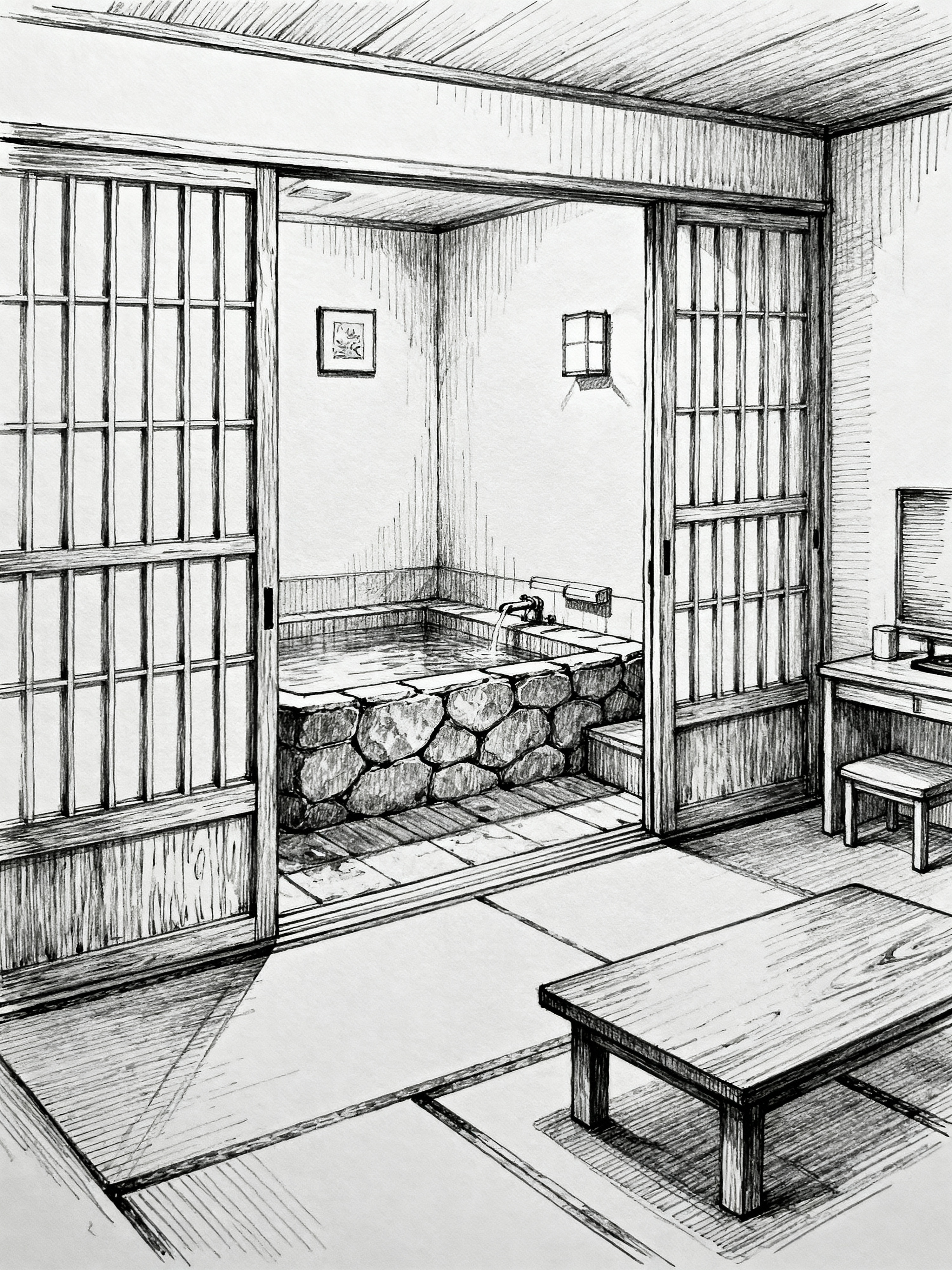 (hand-drawn monochrome black and white sketch line drawing)++ of sketch-style interior designed (onsen) apartment interior. a sketch of interior. with . . a sketch of interior. trending on artstation. black and white line drawing sketch without colors.