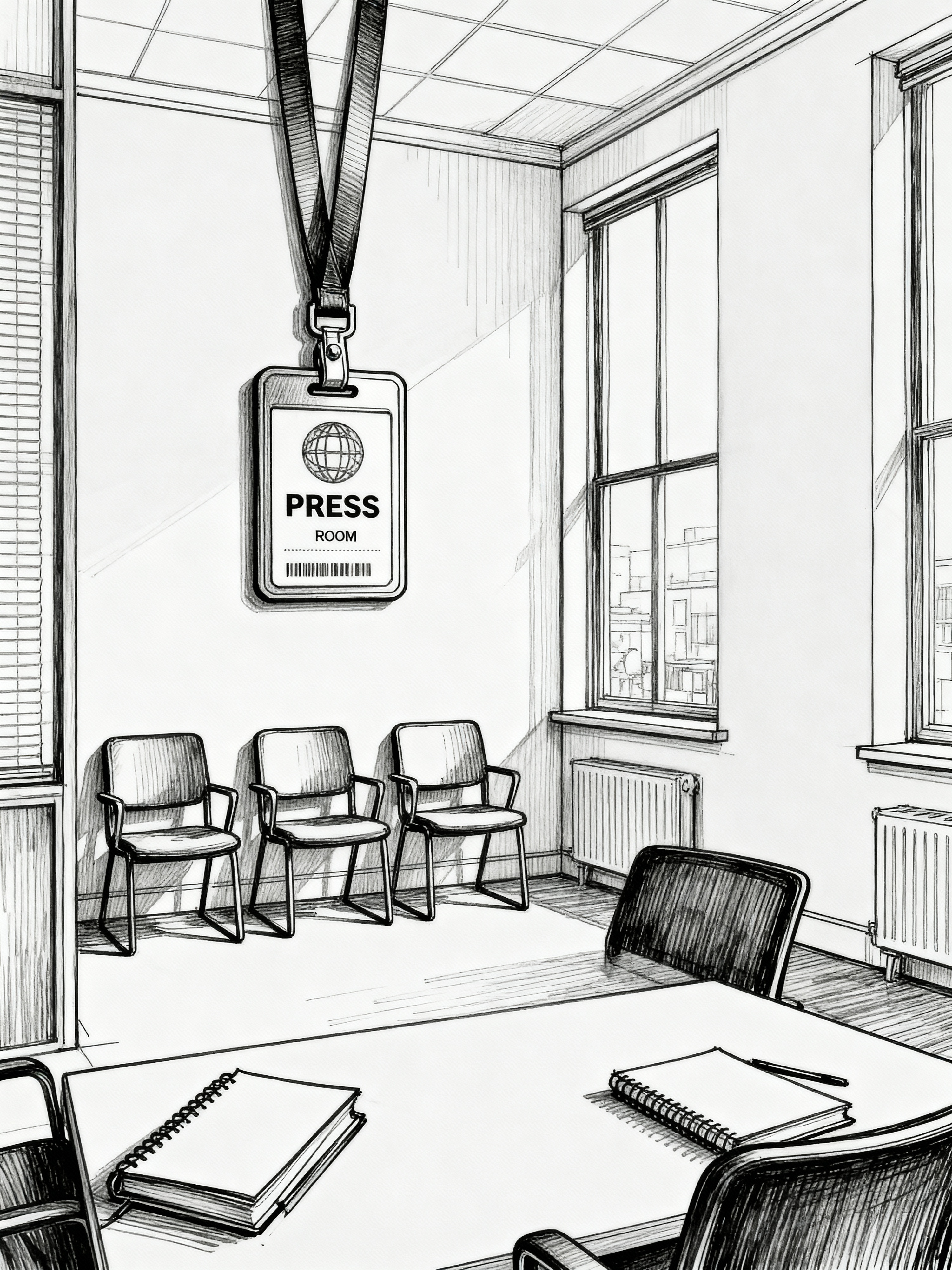 (hand-drawn monochrome black and white sketch line drawing)++ of sketch-style interior designed (press room) apartment interior. a sketch of interior. with . . a sketch of interior. with press badges and chairs and notebooks. trending on artstation. black and white line drawing sketch without colors.