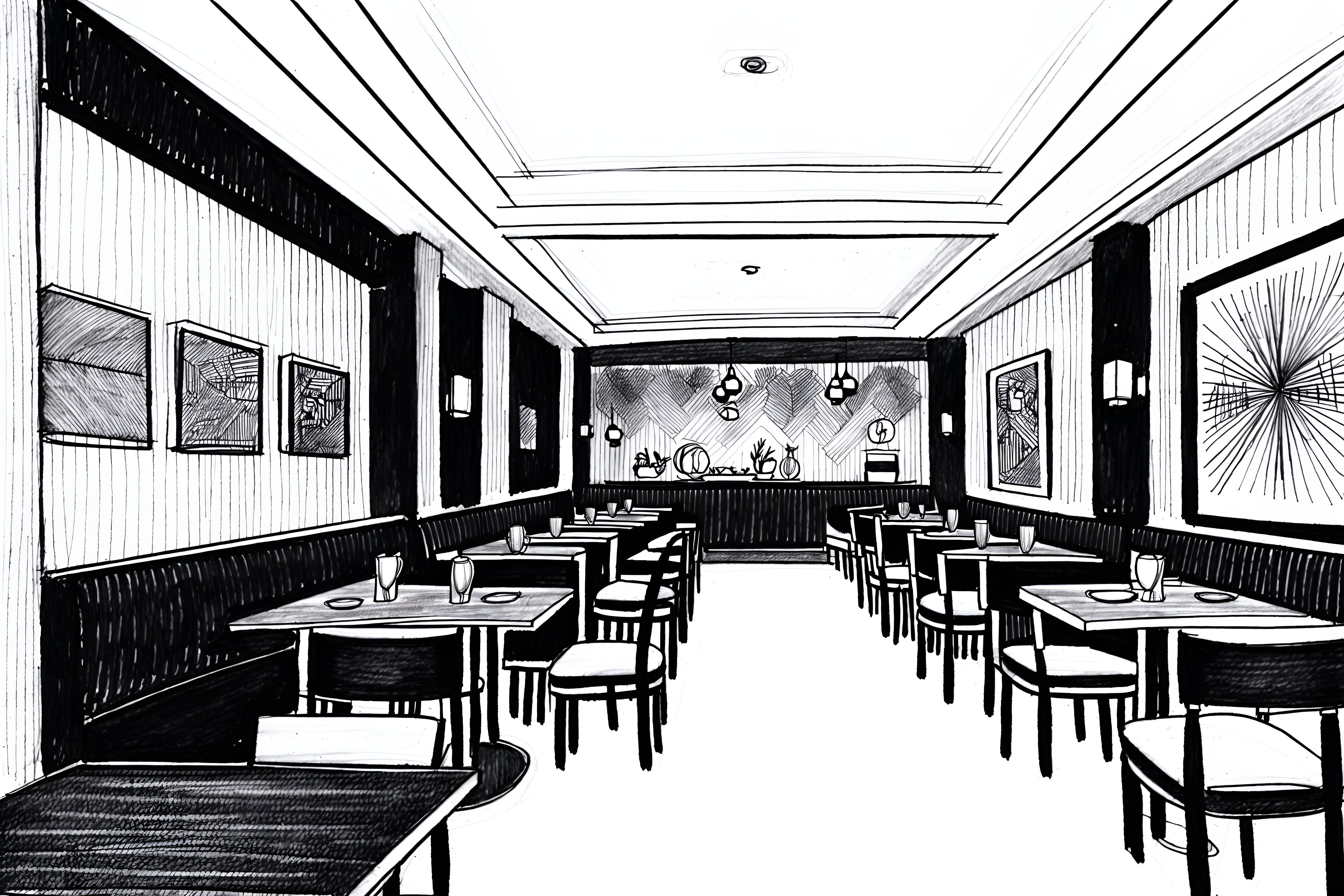 (hand-drawn monochrome black and white sketch line drawing)++ of sketch-style interior designed (restaurant) apartment interior. a sketch of interior. with . . a sketch of interior. with restaurant decor and restaurant bar and restaurant dining tables. trending on artstation. black and white line drawing sketch without colors. masterpiece, cinematic light, ultrarealistic+, photorealistic+, 8k, raw photo, realistic, sharp focus on eyes, (symmetrical eyes), (intact eyes), hyperrealistic, highest quality, best quality, , highly detailed, masterpiece, best quality, extremely detailed 8k wallpaper, masterpiece, best quality, ultra-detailed, best shadow, detailed background, detailed face, detailed eyes, high contrast, best illumination, detailed face, dulux, caustic, dynamic angle, detailed glow. dramatic lighting. highly detailed, insanely detailed hair, symmetrical, intricate details, professionally retouched, 8k high definition. strong bokeh. award winning photo.