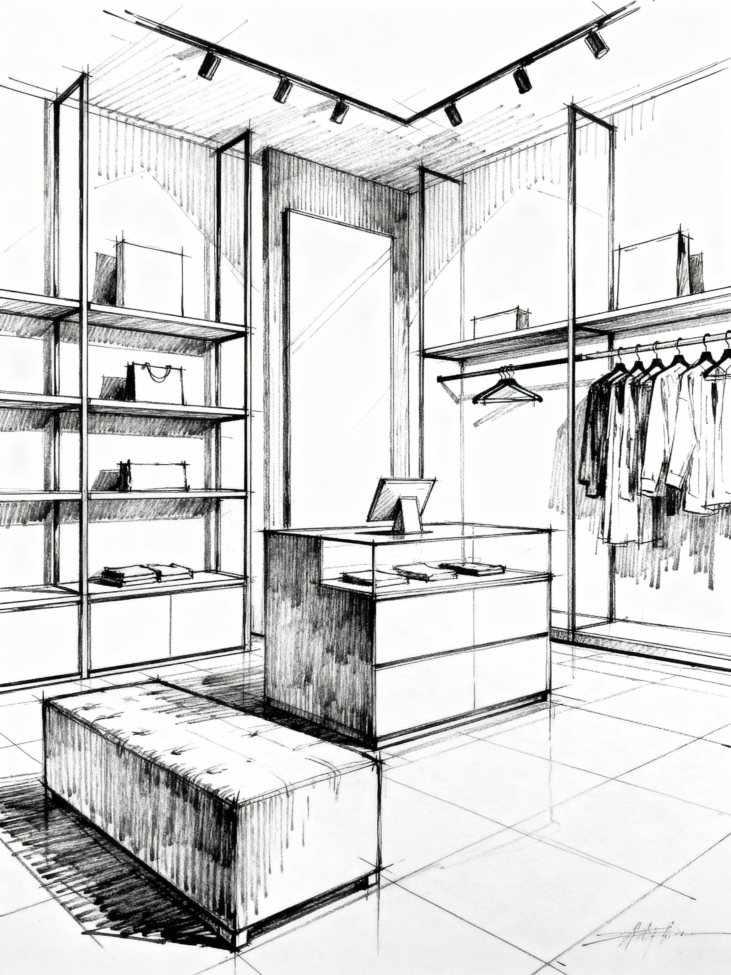 (hand-drawn monochrome black and white sketch line drawing)++ of sketch-style interior designed (store) apartment interior. a sketch of interior. with . . a sketch of interior. with shelving units and display racks and store fixtures and fittings. trending on artstation. black and white line drawing sketch without colors.