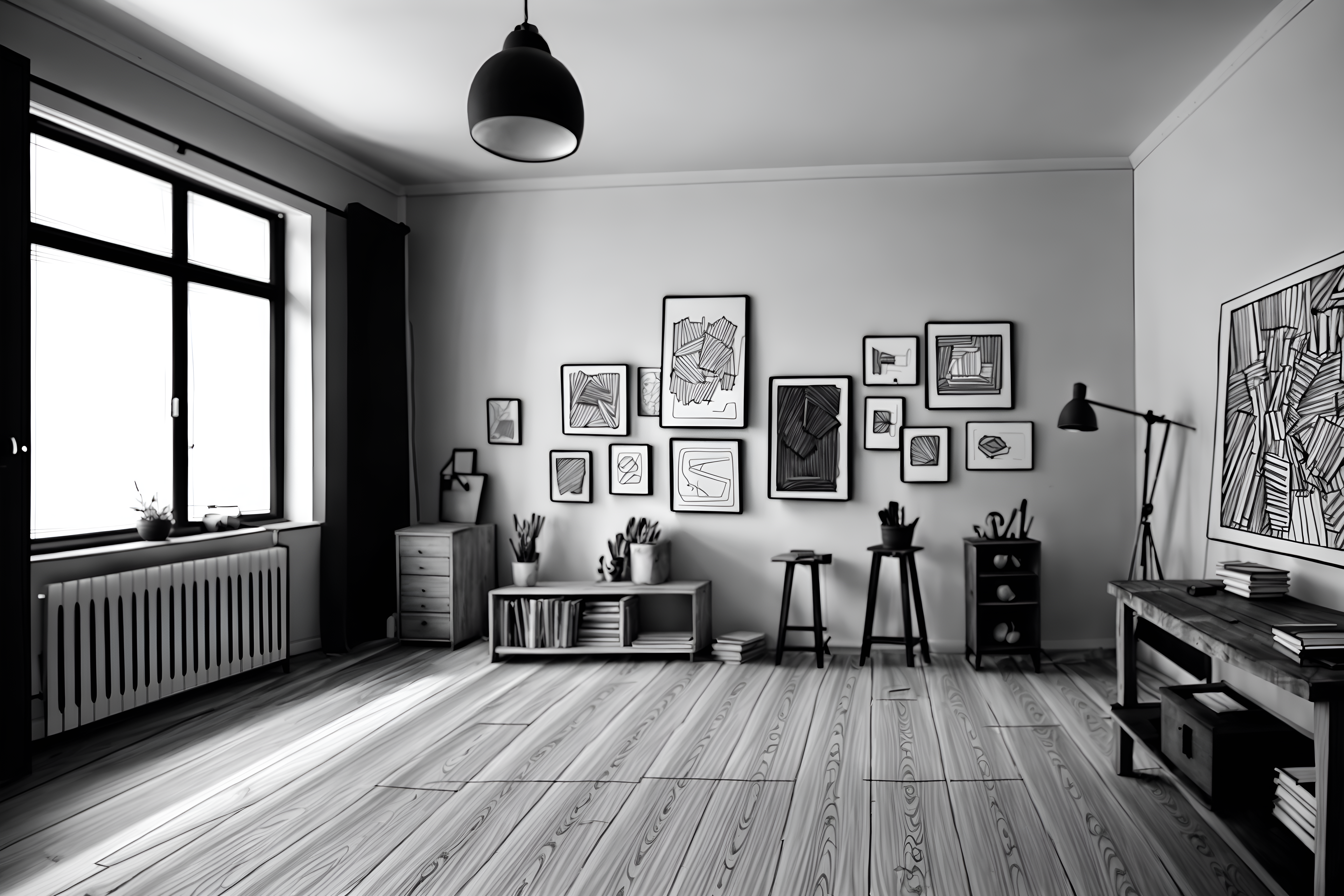 (hand-drawn monochrome black and white sketch line drawing)++ of sketch-style interior designed (workshop) apartment interior. a sketch of interior. with . . a sketch of interior. with tool wall and messy and wooden workbench. trending on artstation. black and white line drawing sketch without colors. masterpiece, cinematic light, ultrarealistic+, photorealistic+, 8k, raw photo, realistic, sharp focus on eyes, (symmetrical eyes), (intact eyes), hyperrealistic, highest quality, best quality, , highly detailed, masterpiece, best quality, extremely detailed 8k wallpaper, masterpiece, best quality, ultra-detailed, best shadow, detailed background, detailed face, detailed eyes, high contrast, best illumination, detailed face, dulux, caustic, dynamic angle, detailed glow. dramatic lighting. highly detailed, insanely detailed hair, symmetrical, intricate details, professionally retouched, 8k high definition. strong bokeh. award winning photo.