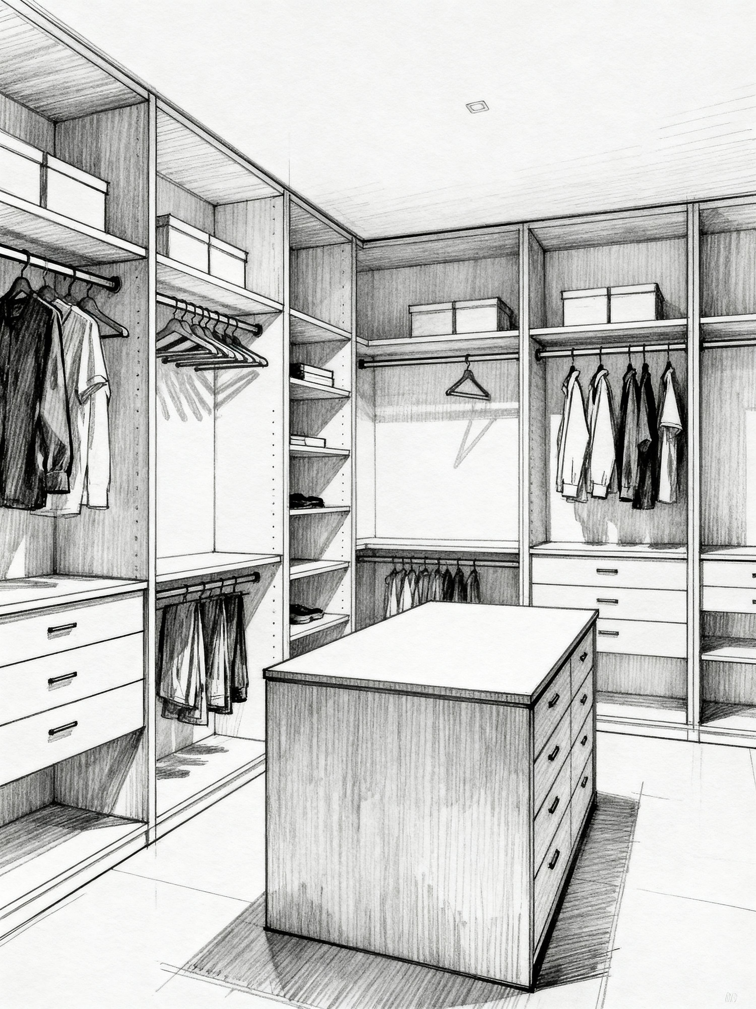 (hand-drawn monochrome black and white sketch line drawing)++ of sketch-style interior designed (walk in closet) apartment interior. a sketch of interior. with . . a sketch of interior. trending on artstation. black and white line drawing sketch without colors.