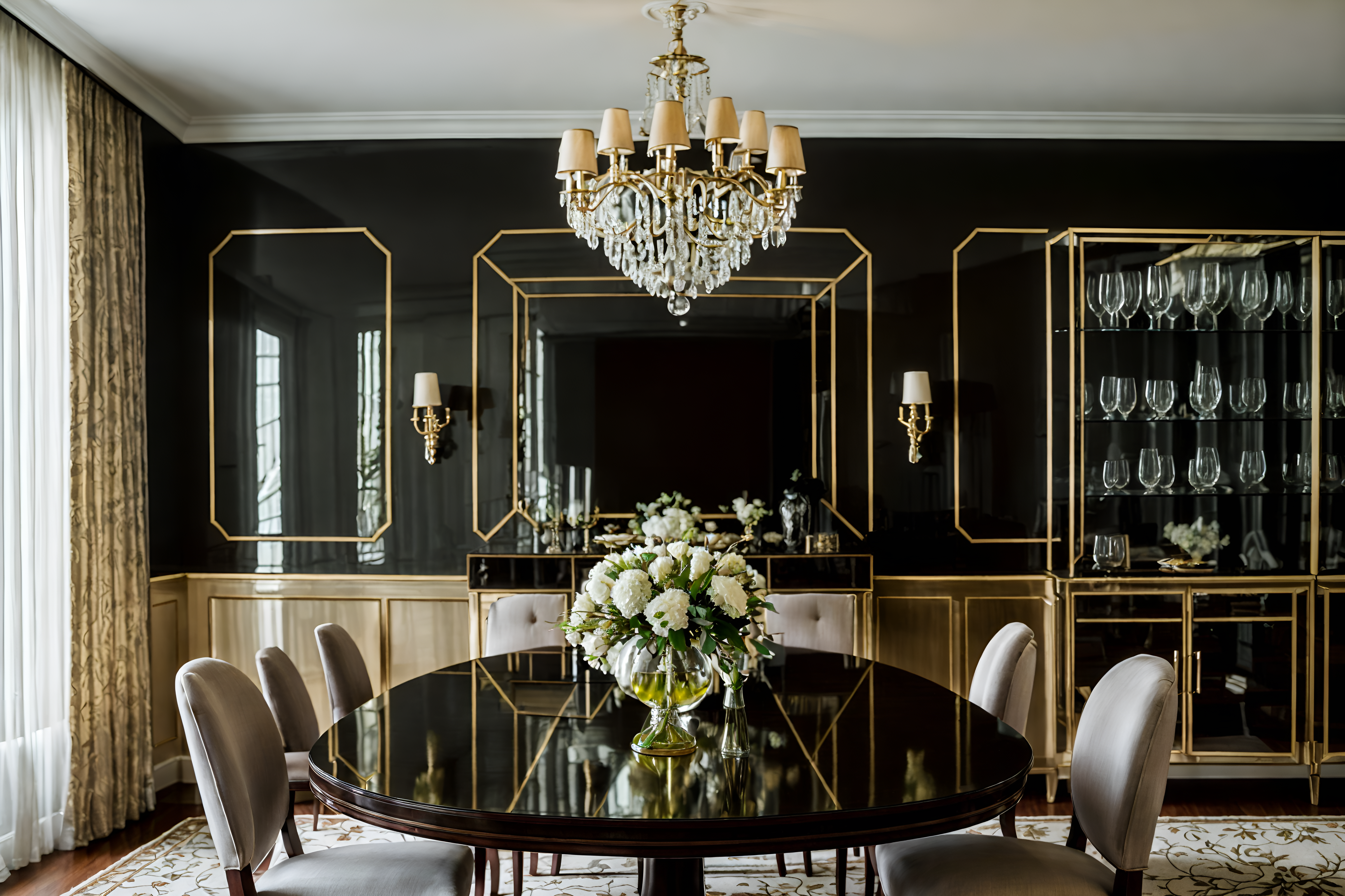 photo from pinterest of hollywood glam-style interior designed (dining room interior) with plant and painting or photo on wall and dining table chairs and vase and table cloth and dining table and bookshelves and plates, cutlery and glasses on dining table cinematic photo, highly detailed, cinematic lighting, ultra-detailed, ultrarealistic, photorealism, 8k. trending on pinterest. hollywood glam interior design style. masterpiece, cinematic light, ultrarealistic+, photorealistic+, 8k, raw photo, realistic, sharp focus on eyes, (symmetrical eyes), (intact eyes), hyperrealistic, highest quality, best quality, , highly detailed, masterpiece, best quality, extremely detailed 8k wallpaper, masterpiece, best quality, ultra-detailed, best shadow, detailed background, detailed face, detailed eyes, high contrast, best illumination, detailed face, dulux, caustic, dynamic angle, detailed glow. dramatic lighting. highly detailed, insanely detailed hair, symmetrical, intricate details, professionally retouched, 8k high definition. strong bokeh. award winning photo.