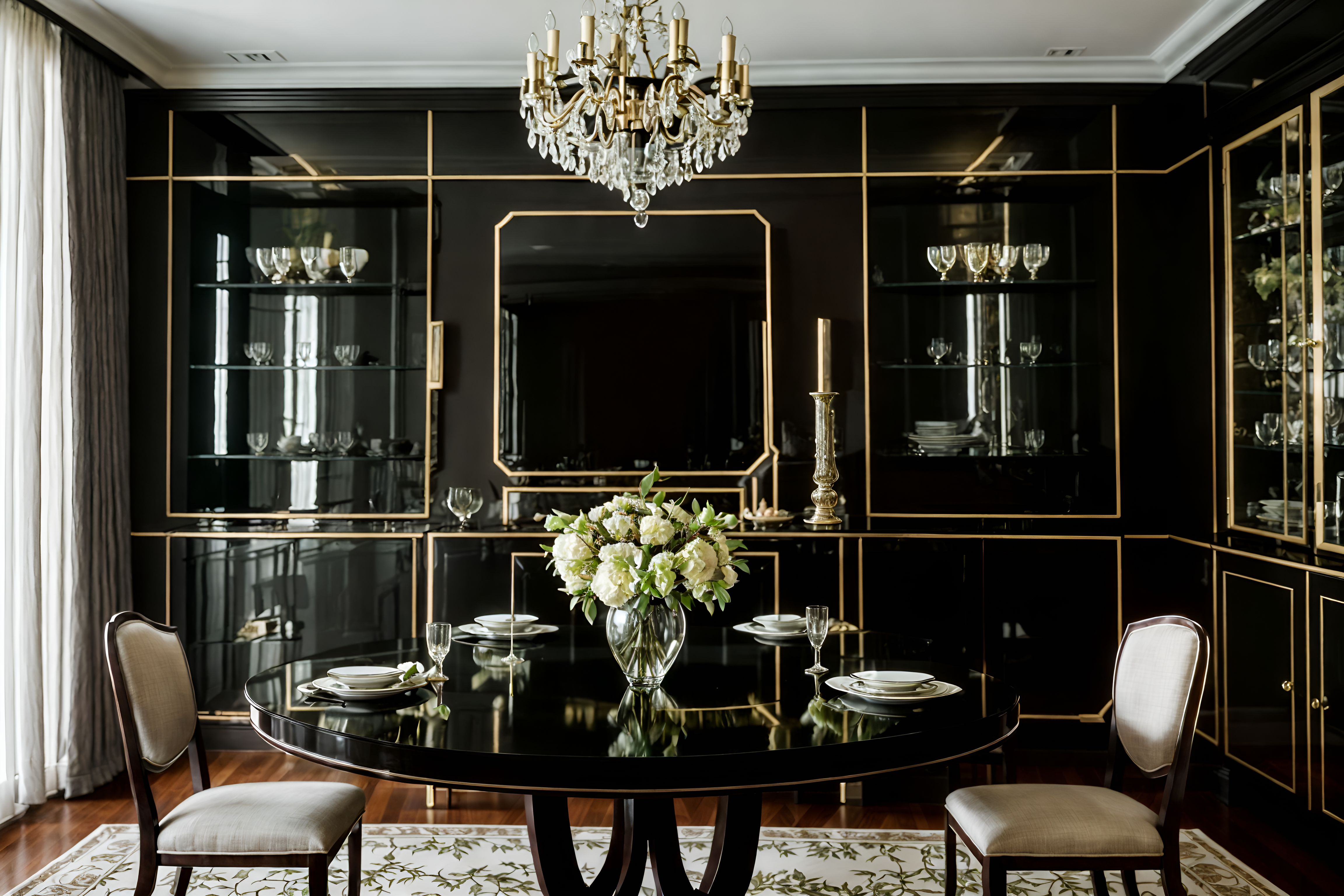 photo from pinterest of hollywood glam-style interior designed (dining room interior) with plant and painting or photo on wall and dining table chairs and vase and table cloth and dining table and bookshelves and plates, cutlery and glasses on dining table cinematic photo, highly detailed, cinematic lighting, ultra-detailed, ultrarealistic, photorealism, 8k. trending on pinterest. hollywood glam interior design style. masterpiece, cinematic light, ultrarealistic+, photorealistic+, 8k, raw photo, realistic, sharp focus on eyes, (symmetrical eyes), (intact eyes), hyperrealistic, highest quality, best quality, , highly detailed, masterpiece, best quality, extremely detailed 8k wallpaper, masterpiece, best quality, ultra-detailed, best shadow, detailed background, detailed face, detailed eyes, high contrast, best illumination, detailed face, dulux, caustic, dynamic angle, detailed glow. dramatic lighting. highly detailed, insanely detailed hair, symmetrical, intricate details, professionally retouched, 8k high definition. strong bokeh. award winning photo.