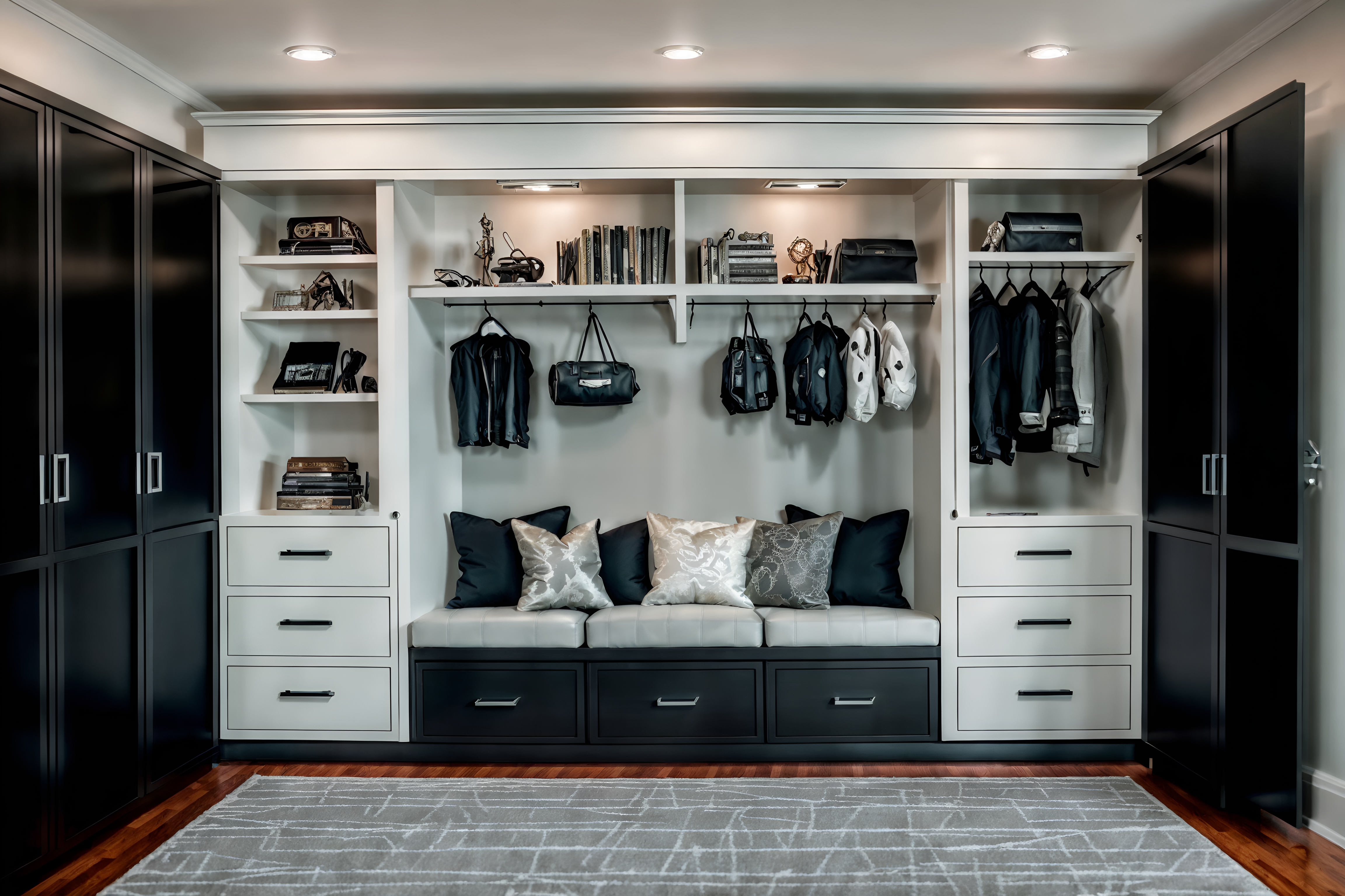 photo from pinterest of hollywood glam-style interior designed (drop zone interior) with high up storage and storage baskets and wall hooks for coats and a bench and lockers and storage drawers and shelves for shoes and cabinets cinematic photo, highly detailed, cinematic lighting, ultra-detailed, ultrarealistic, photorealism, 8k. trending on pinterest. hollywood glam interior design style. masterpiece, cinematic light, ultrarealistic+, photorealistic+, 8k, raw photo, realistic, sharp focus on eyes, (symmetrical eyes), (intact eyes), hyperrealistic, highest quality, best quality, , highly detailed, masterpiece, best quality, extremely detailed 8k wallpaper, masterpiece, best quality, ultra-detailed, best shadow, detailed background, detailed face, detailed eyes, high contrast, best illumination, detailed face, dulux, caustic, dynamic angle, detailed glow. dramatic lighting. highly detailed, insanely detailed hair, symmetrical, intricate details, professionally retouched, 8k high definition. strong bokeh. award winning photo.