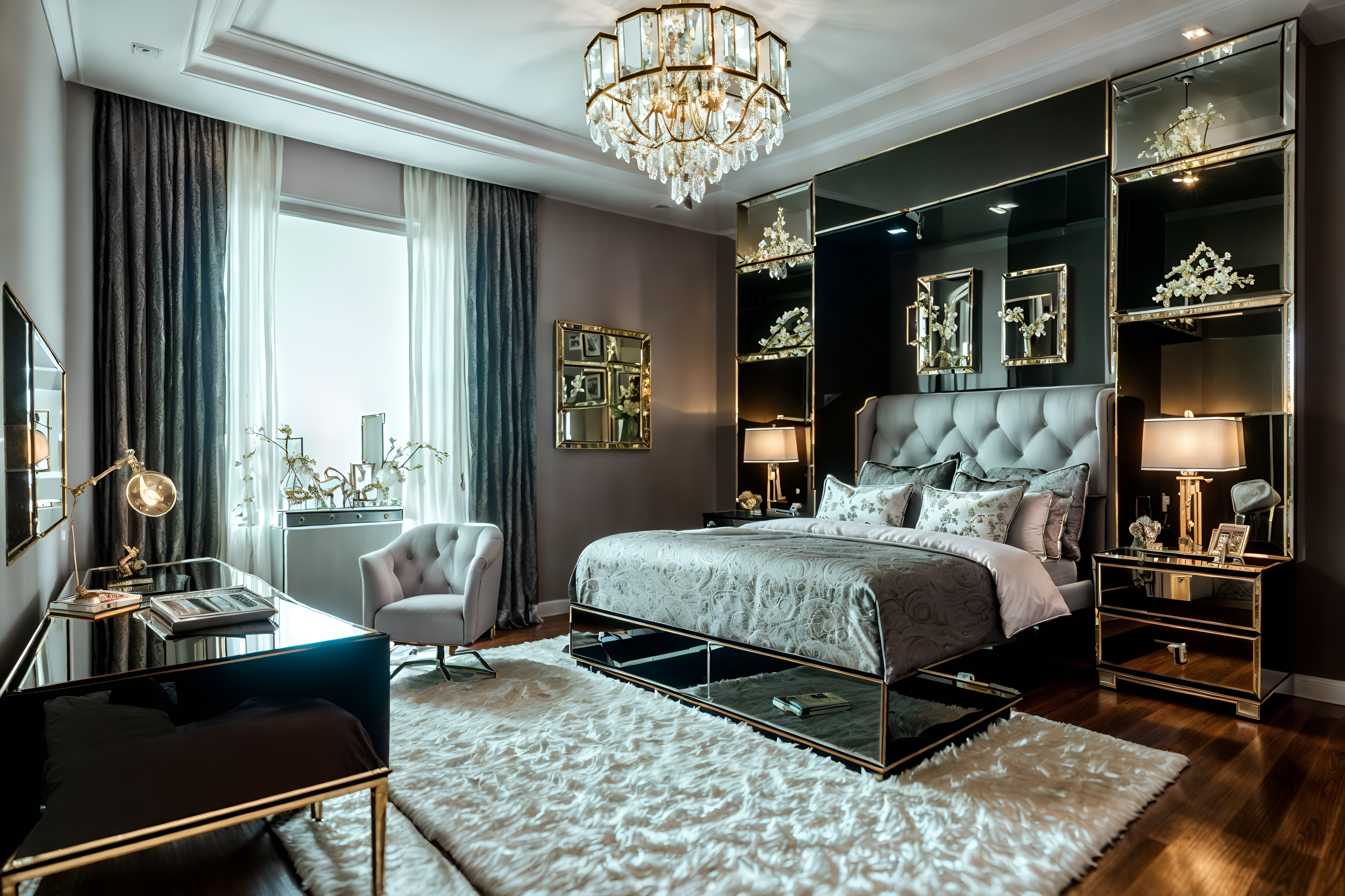 hollywood glam kids roomsinterior decorate this kids room with hollywood glam style. . . with bedside table or night stand and kids desk and headboard and night light and dresser closet and mirror and storage bench or ottoman and plant. . with velvet upholstery and metallic accents and dramatic lighting and luxurious fabrics and mirrored surfaces and crystal chandeliers and art deco influence and glamorous style. . .